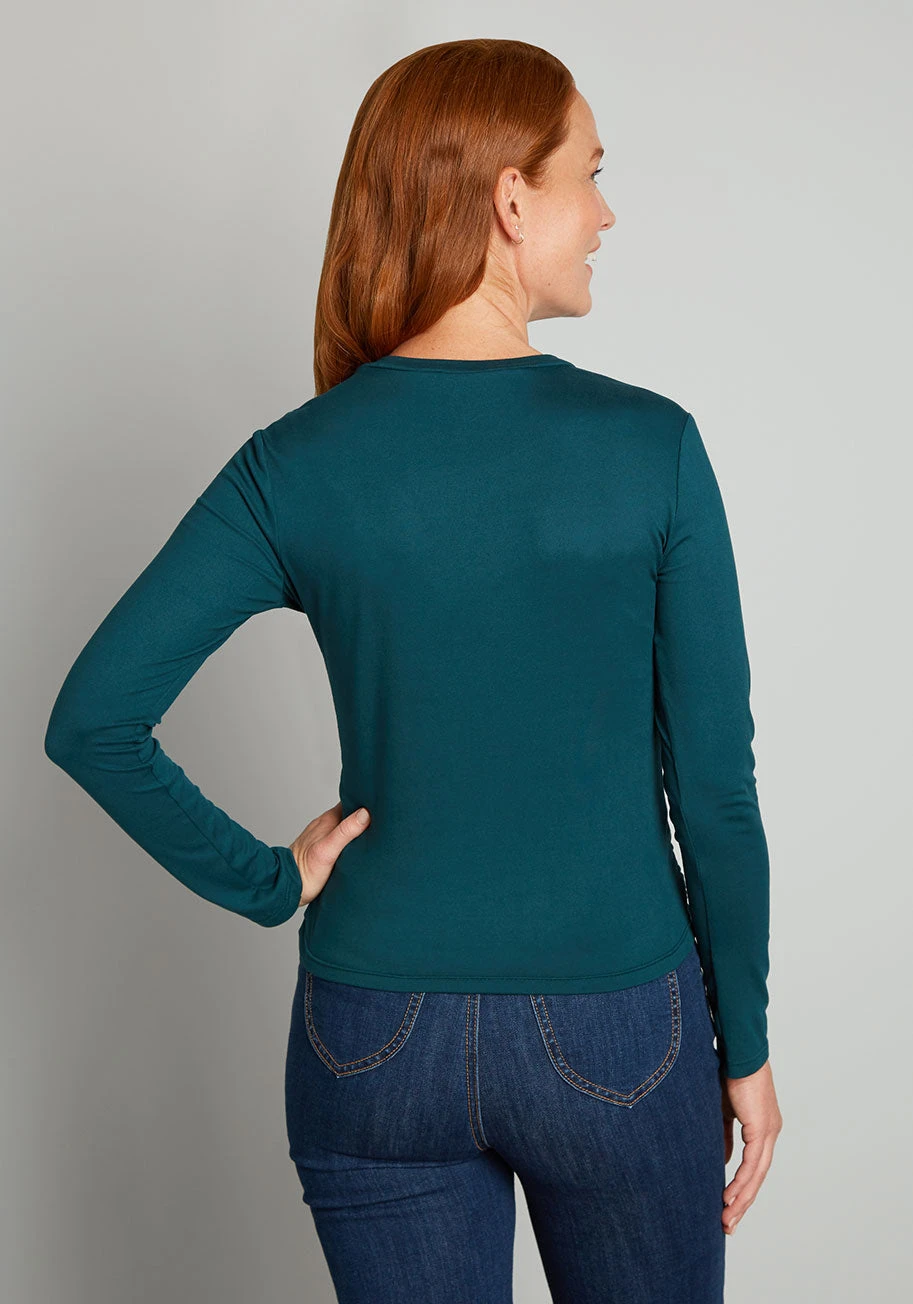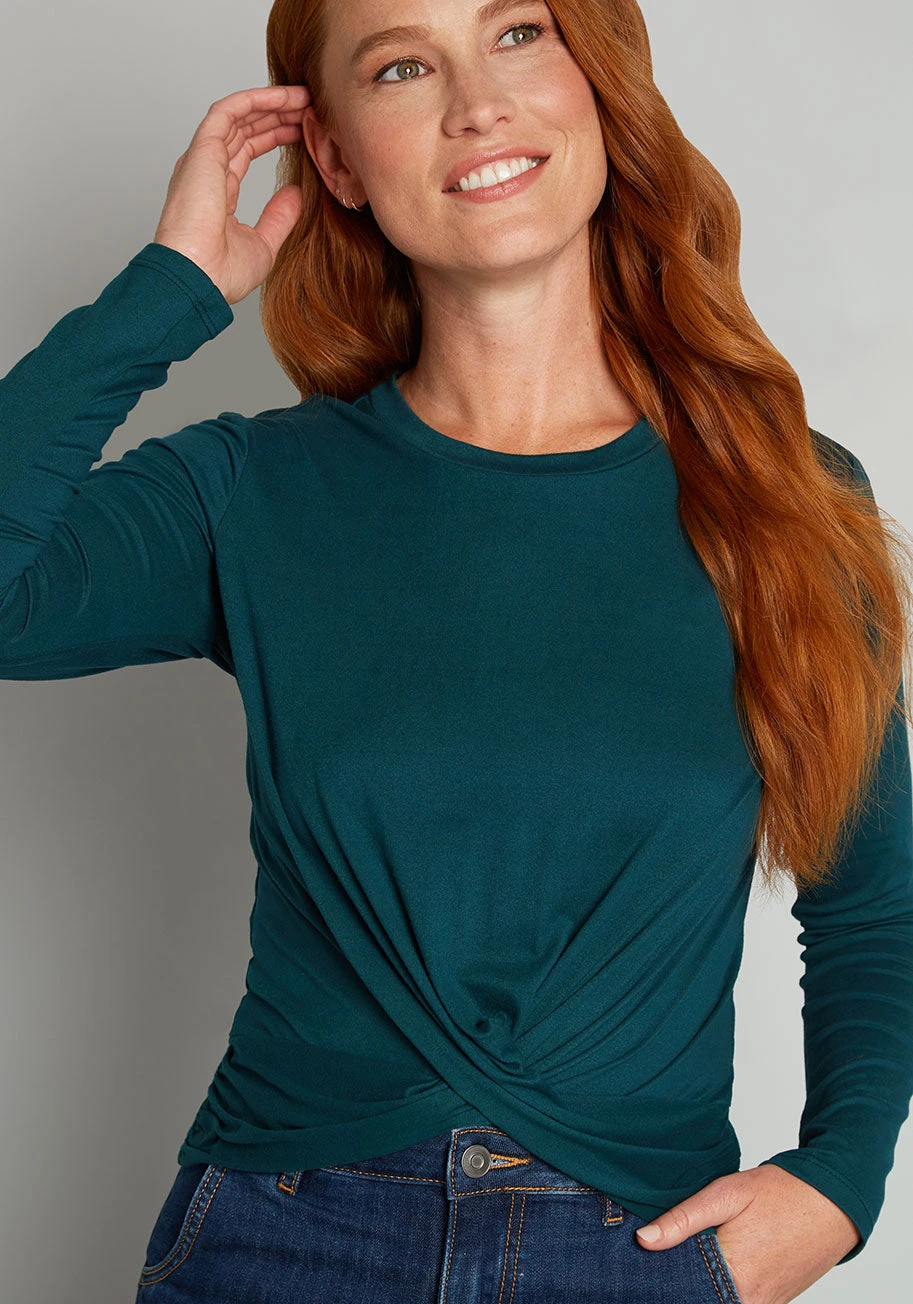 We all need a little sprucing up in our knitwear department, and what better way to refresh yours than with this richly teal-hued long sleeve top from our ModCloth namesake label. Made from a super soft, stretchy knit, this subtly cropped long sleeve tee features a chic gathered twist-knot detail at the front hem, making this an elevated basic that can be styled and layered in a multitude of ways. So versatile and effortlessly stylish, this crew neck knit top will surely become one of your favorite go-to pieces.