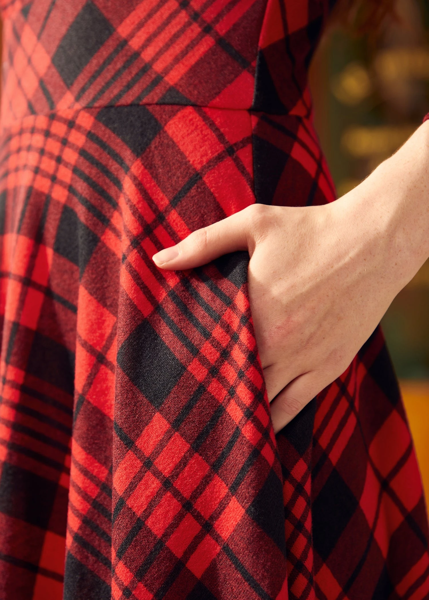 Embrace a playful pattern with the All About the Doodlebug Fit & Flare Dress in cherry grid from our ModCloth namesake label. This red plaid knit dress offers a fetching fit-and-flare silhouette with a boatneck and three-quarter sleeves. The medium stretch and secure zipper make it a stylish staple for harvest festivals or pumpkin patch visits.