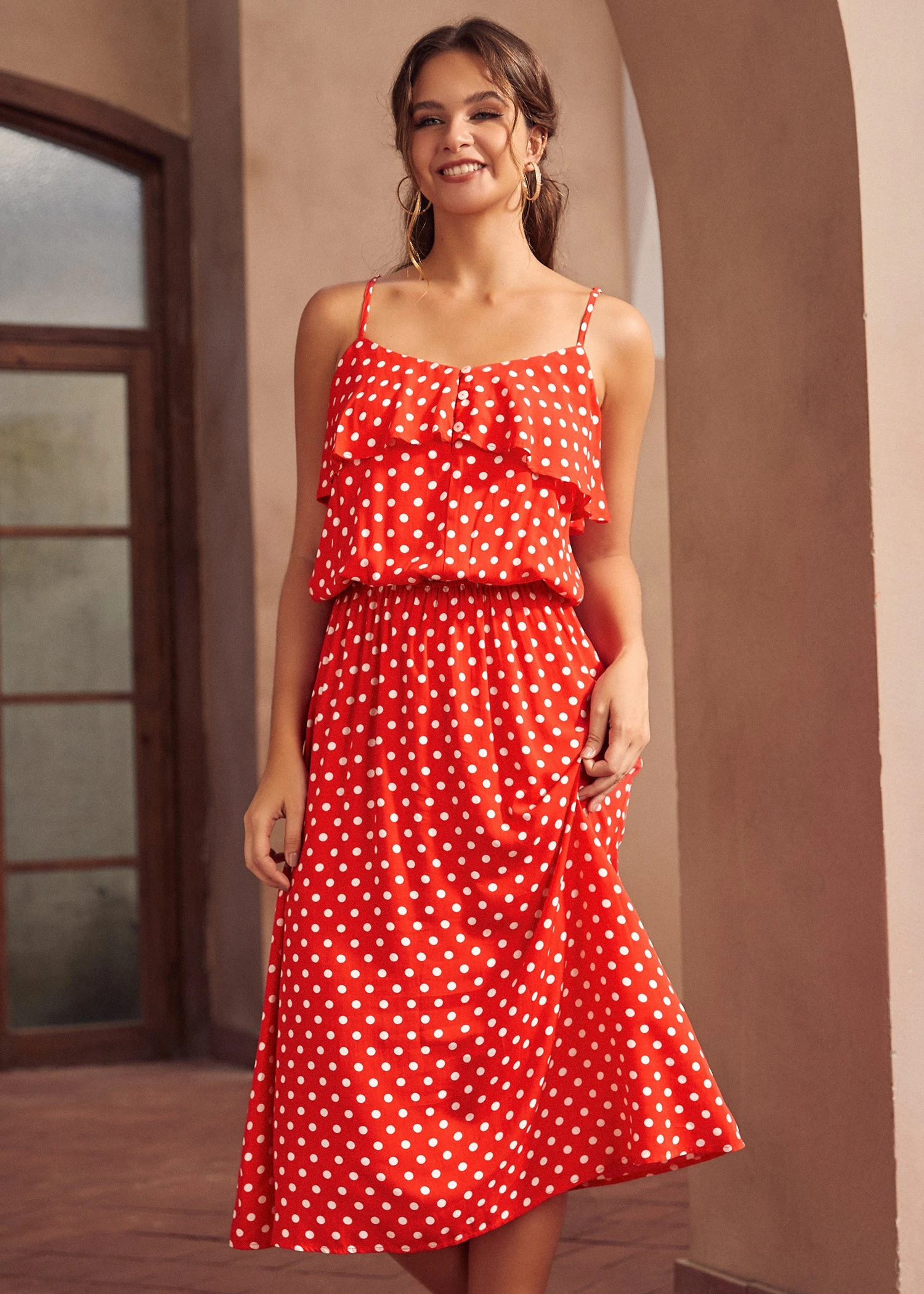 Twirl into a world of playful sophistication with the red with white polka dot midi dress from our ModCloth namesake label. Its charming ruffle top and stretchable cinched waist offer a silhouette that’s both flattering and forgiving, ideal for day-long wear. From picnics in the park to casual Fridays at the office, this dress promises versatility with a splash of fun. Pair it with sandals for a laid-back look or elevate it with heels for an evening out; either way, you’re set to make an impression.