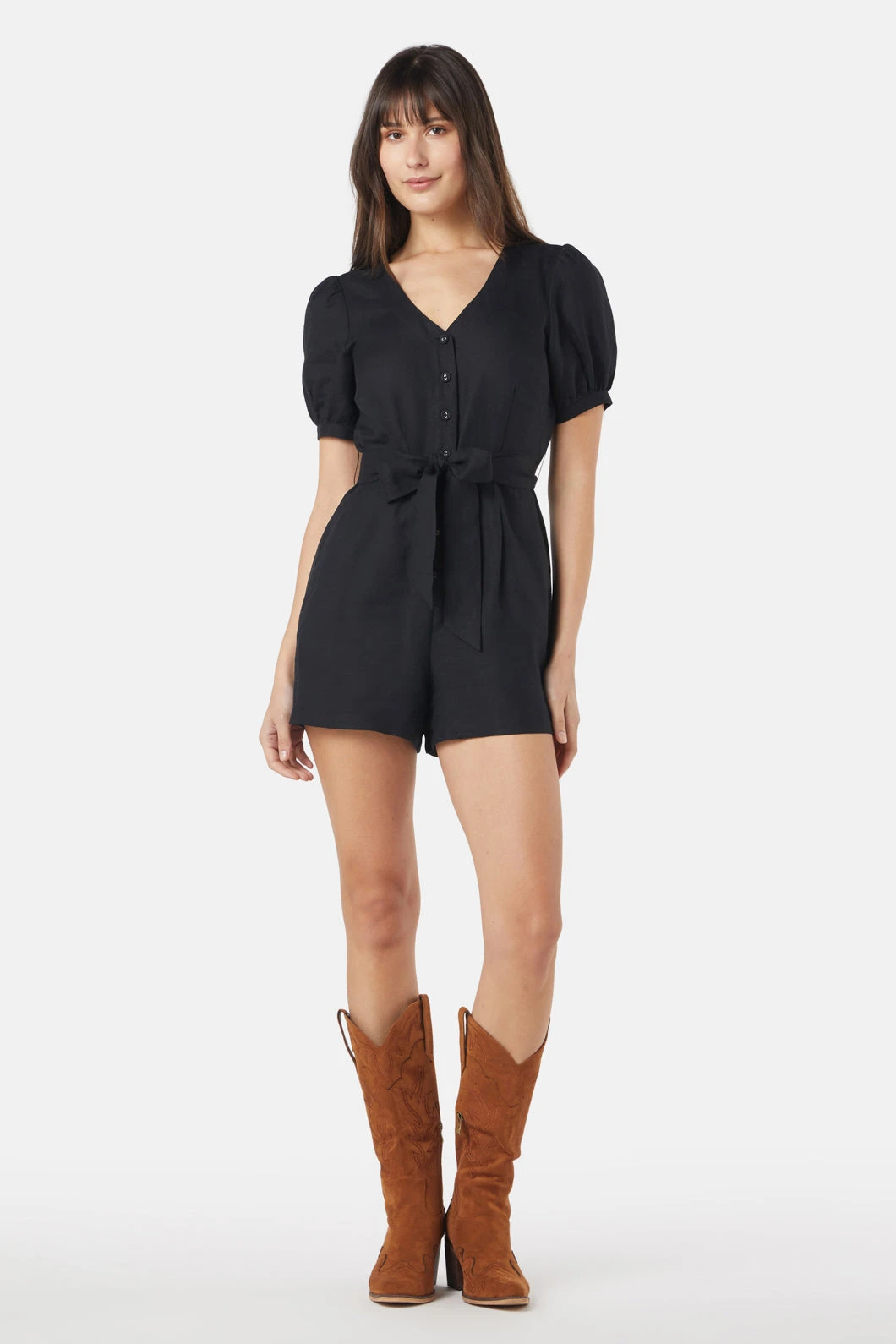 Slip into the Bianca Playsuit when you mean business – but only if that business involves stealing the spotlight with killer style. This isn’t your average playsuit; it’s a black beauty with a V-neckline that plunges just enough to say hello, and a button-through front to keep things interesting. The short puff sleeves add a dash of drama, while the large darts cinch the waist for that oh-so-flattering fit we all crave. The trick doesn’t stop there: with a short length and wide-cut leg, your legs look like they go on for days, and the handy side pockets mean your essentials are always within reach (because who doesn’t love pockets?). Crafted from a premium linen cotton blend fabric, the Bianca Playsuit is your new go-to for turning heads while keeping cool. Whether it’s a brunch date or a night out with the girls, it’s about to become your closet’s most valuable player.