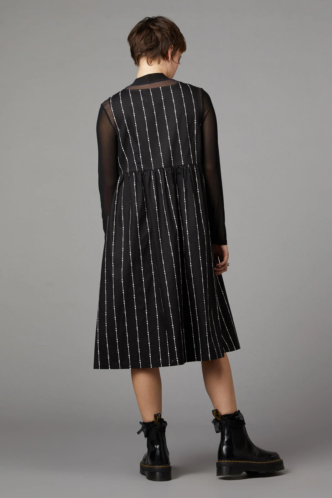 Step into the shadows with the Funny Bone Pinafore by Black Friday. This gothic-inspired midi dress merges dark, edgy aesthetics with a whimsical pinstripe design crafted from skeletal bones. Whether you’re layering for a chilly evening or wearing it solo for a bold statement, this relaxed-fit pinafore is a versatile staple for any alternative wardrobe.