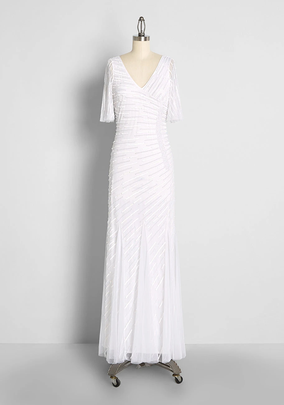 Take their breath away on your special day in this stunning white maxi dress from our ModCloth namesake label! Boasting sheer, short flutter sleeves, a gorgeous V-neckline with a plunging V-back, stylish ruching along the right side, this vintage-inspired gown features white sequins and white beadwork throughout that culminates at the back to create an elegant fishtail effect, and leads into a subtle-yet-striking sweep train.Â