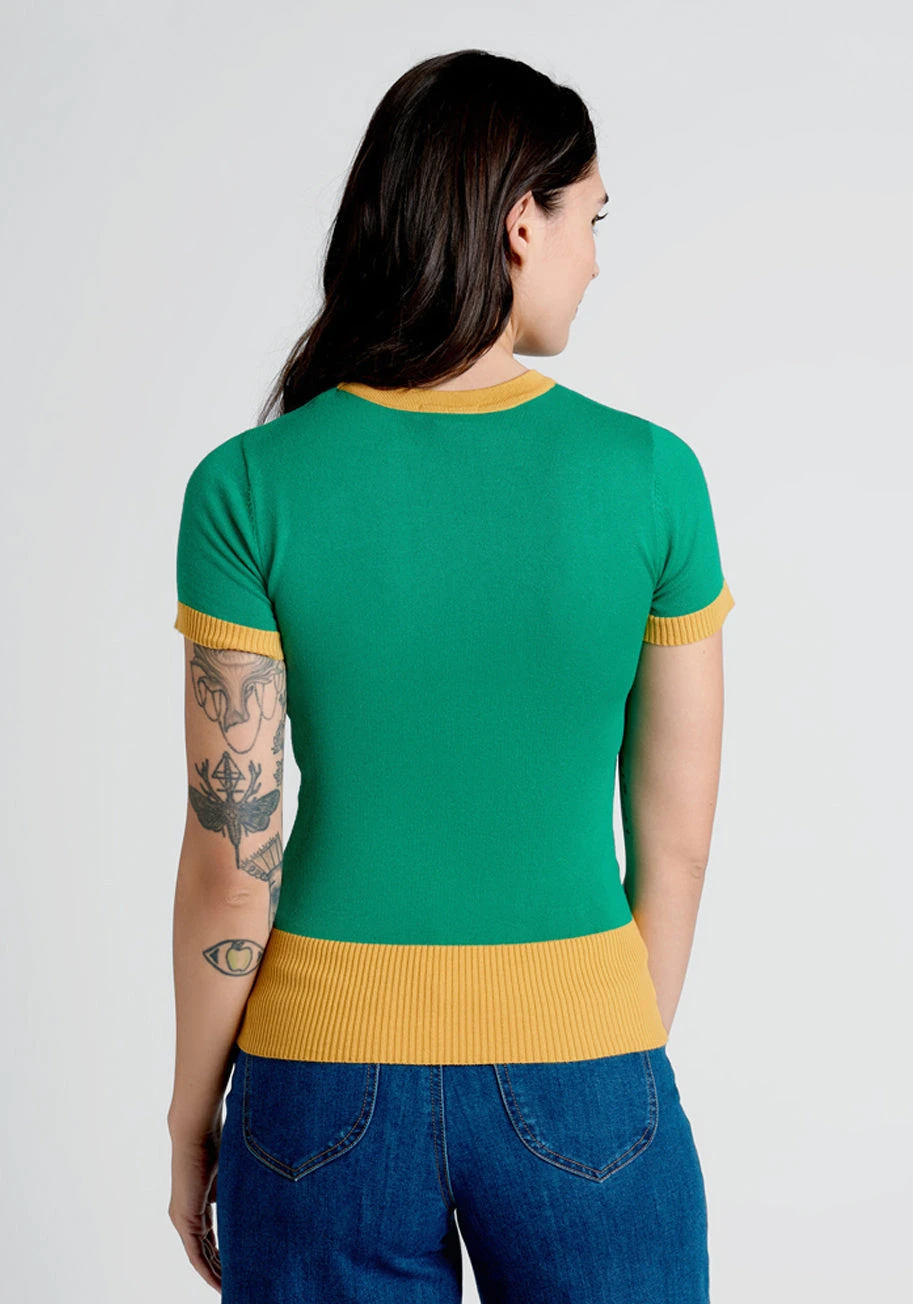 Step back in time with this retro-inspired knit top from Bright and Beautiful. This 70s-style short sleeve sweater captures the essence of vintage fashion with a bold green base and a vibrant ‘Mellow’ bubble letter motif that radiates old-school cool.