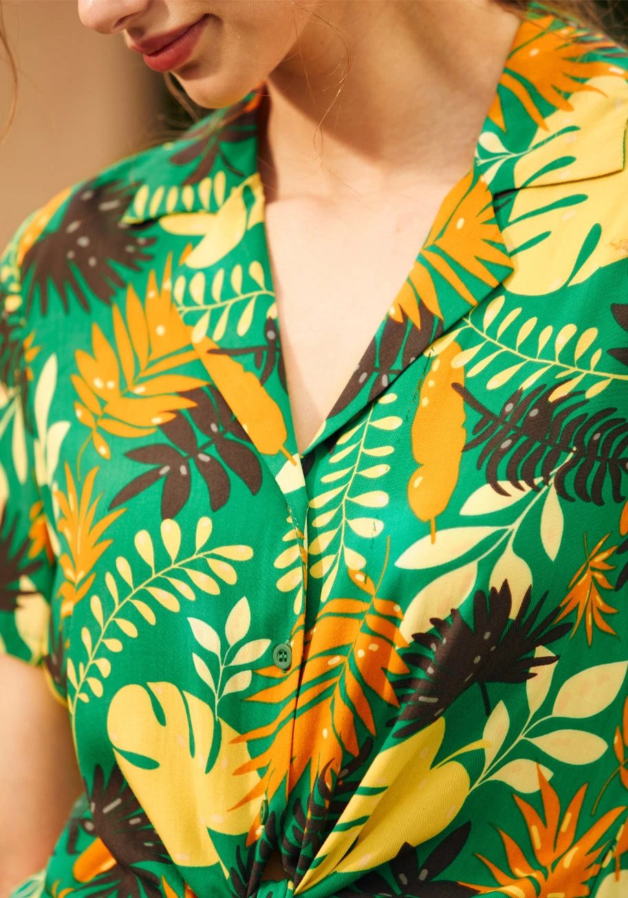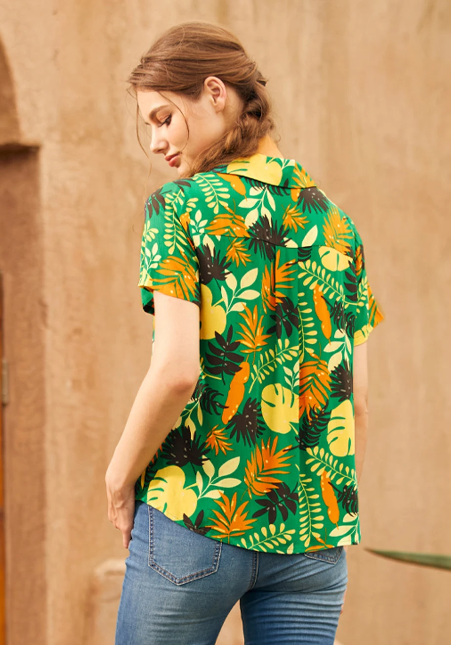 Dive into a garden party or a casual brunch in this delightful green floral button-up shirt from our ModCloth namesake label. Crafted from soft, breathable woven rayon challis, this shirt offers a light and airy fit that moves with you. Its classic collar and button-up design provide a versatile base for countless ensembles, making it a go-to piece for effortless style as you transition from day to evening.