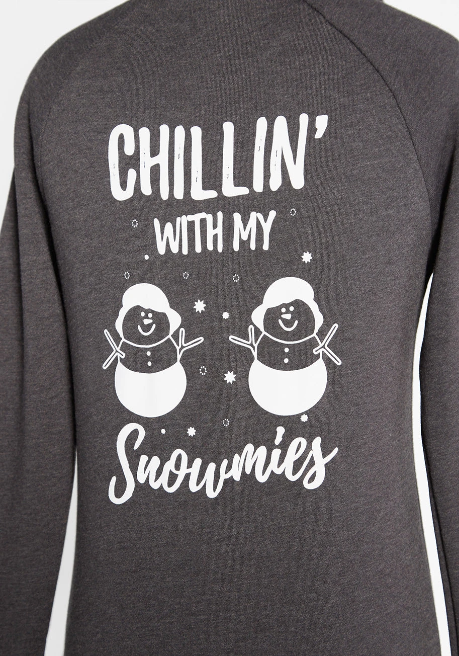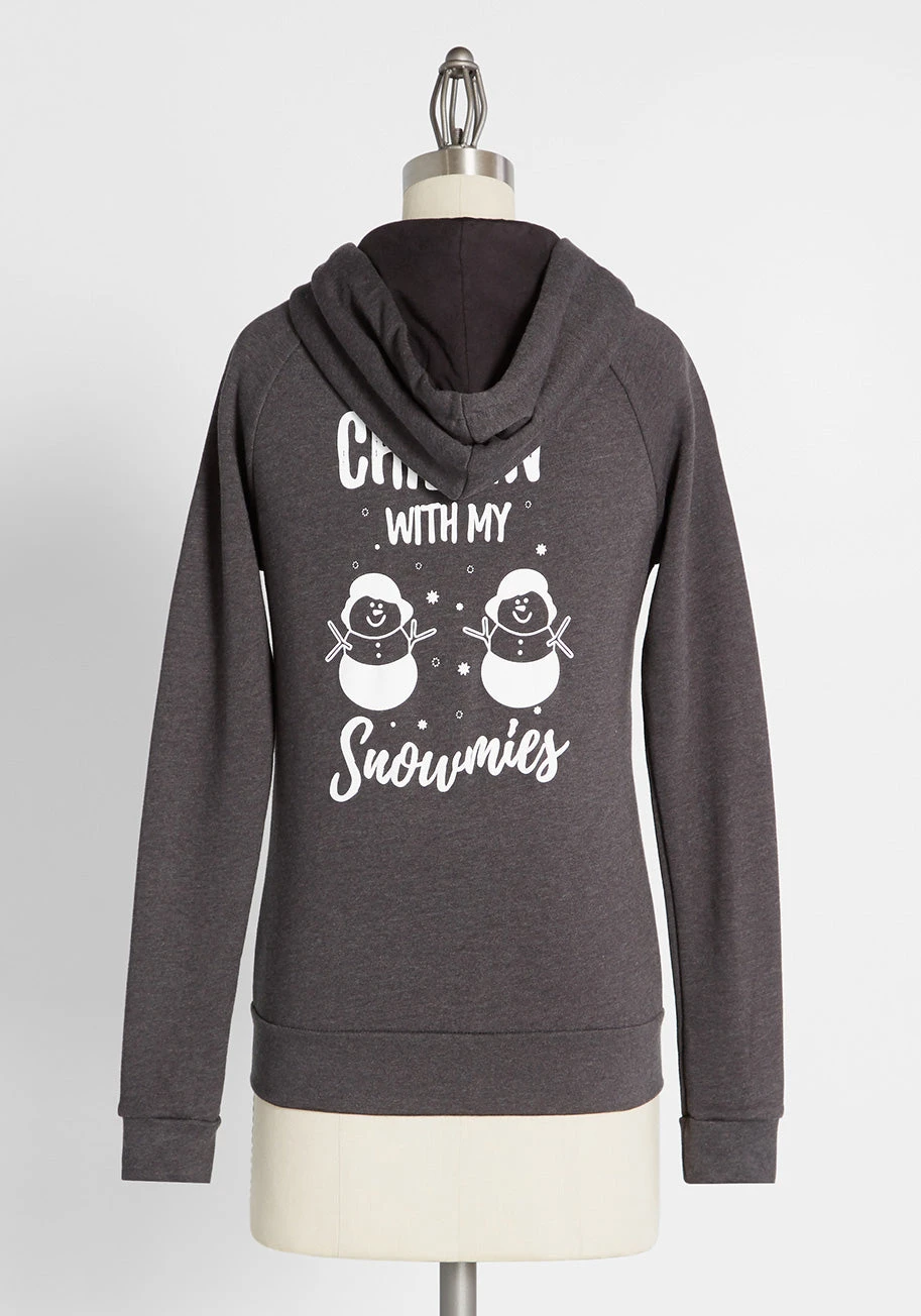 This ultra-soft, cotton-blend graphic hoodie is perfect for light-hearted winter layering. With the back featuring two cheerful snow buddies out on the town, this charcoal gray, zipper-front, hooded sweatshirt also makes a great gift for your favorite “snowmies” to let them know you love the way they chill.