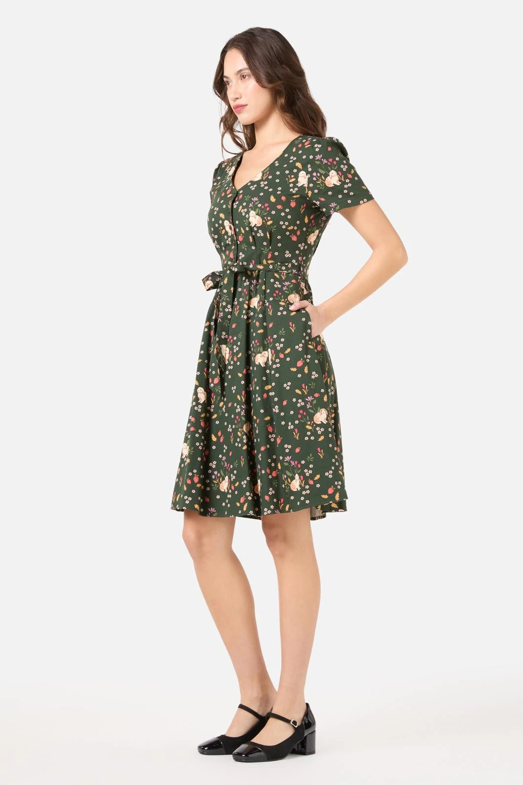 Designed with an open soft V neckline, button-through bodice, and puffed short sleeves, it flatters with a gentle vintage touch. The removable waist tie and paneled skirt finish at the knee for a relaxed, feminine fit that’s perfect for sunny days and garden strolls.