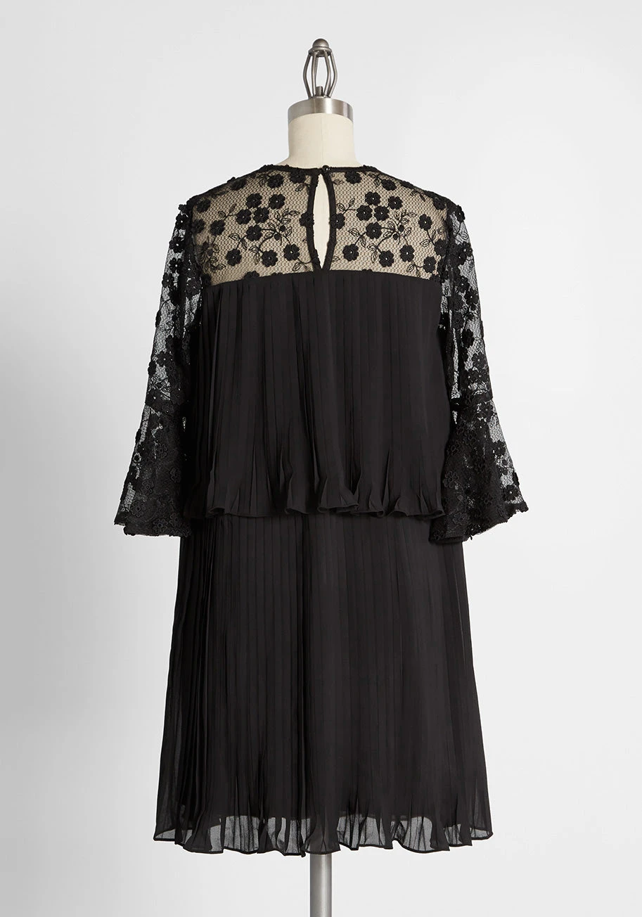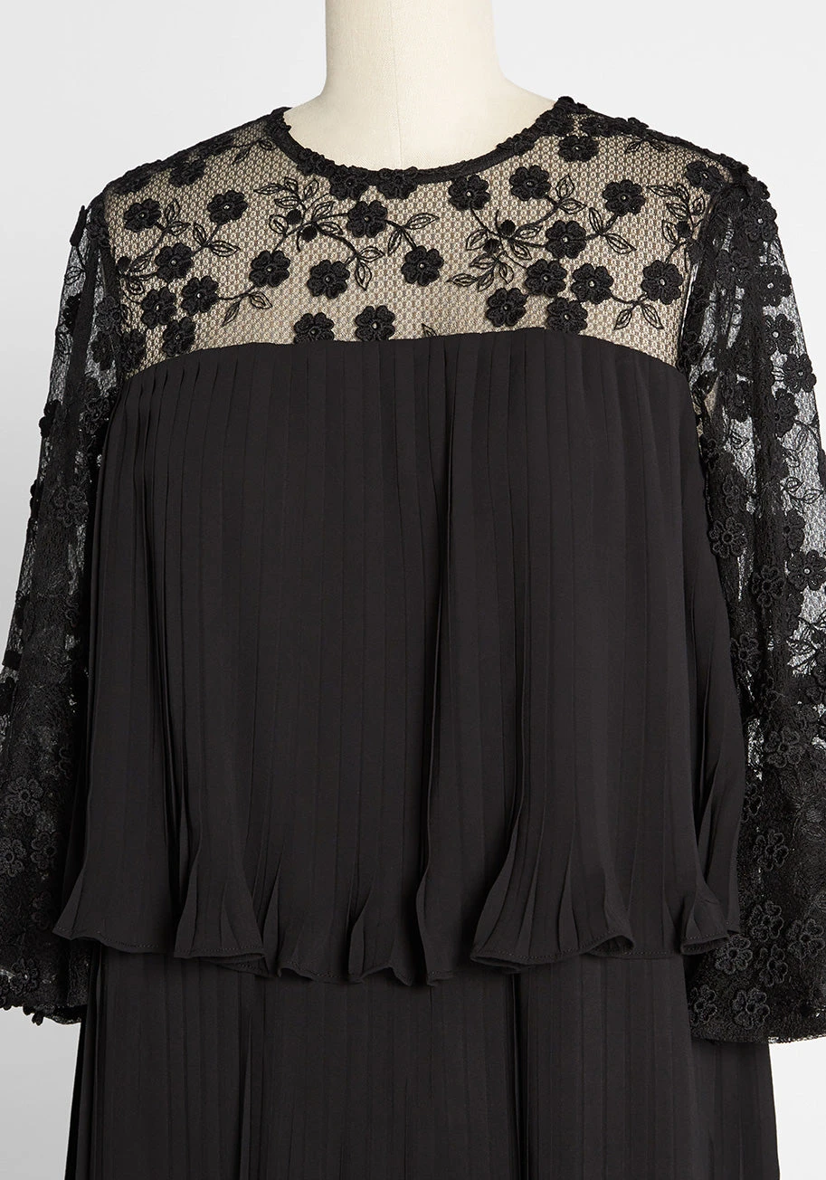 Adorned at the yoke and sleeves with a mesh lace filled with clusters of black floral blooms amidst winding leafy vines, this two-tiered mini dress is a little black dress like no other! Featuring a keyhole button-closure at the back neckline, and sheer ¾ flared sleeves, this tiered silhouette with ruffle edges in solid black chiffon is subtly pleated throughout from below the yoke, making this darling frock one-of-a-kind.