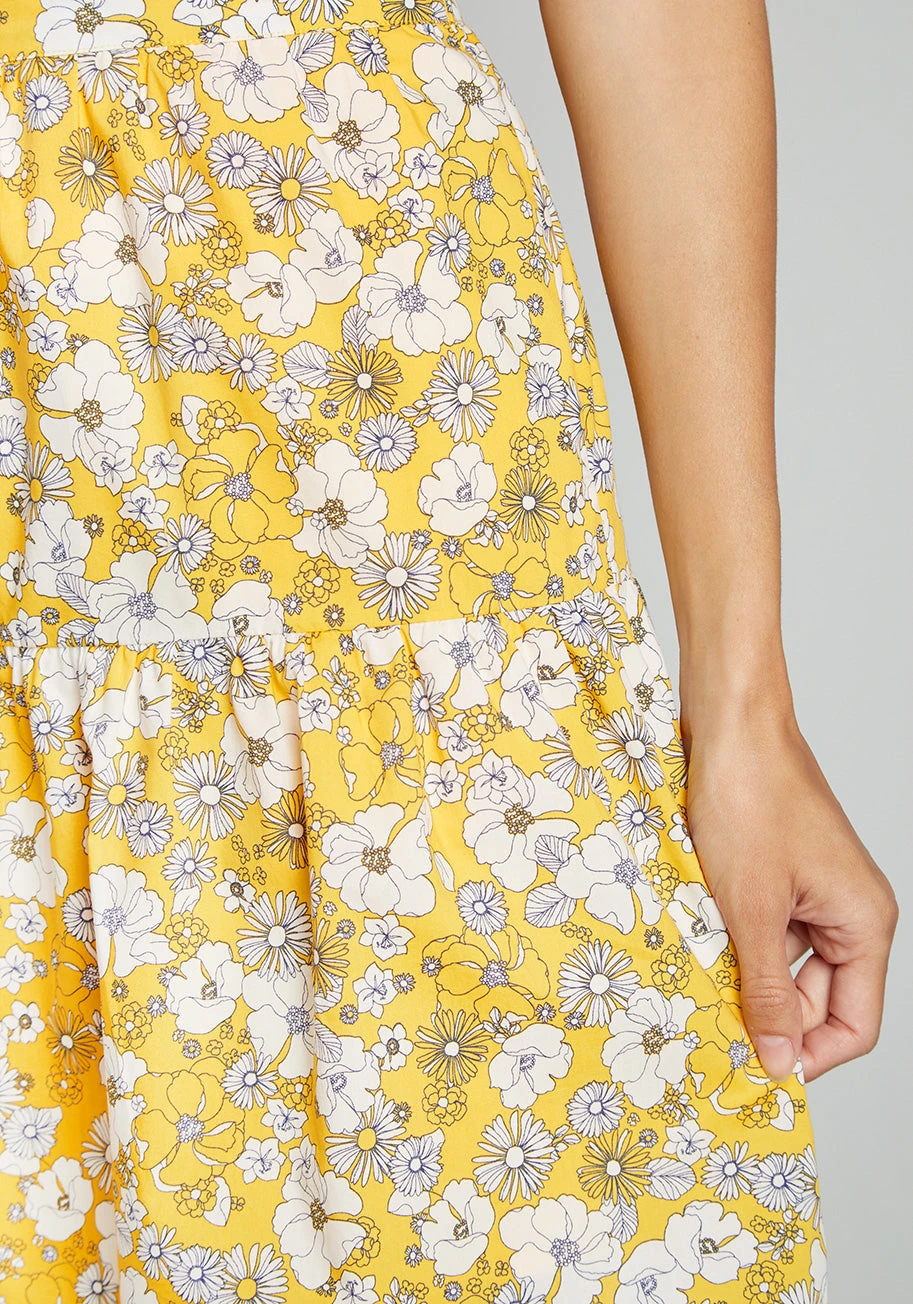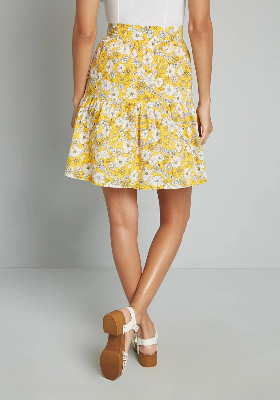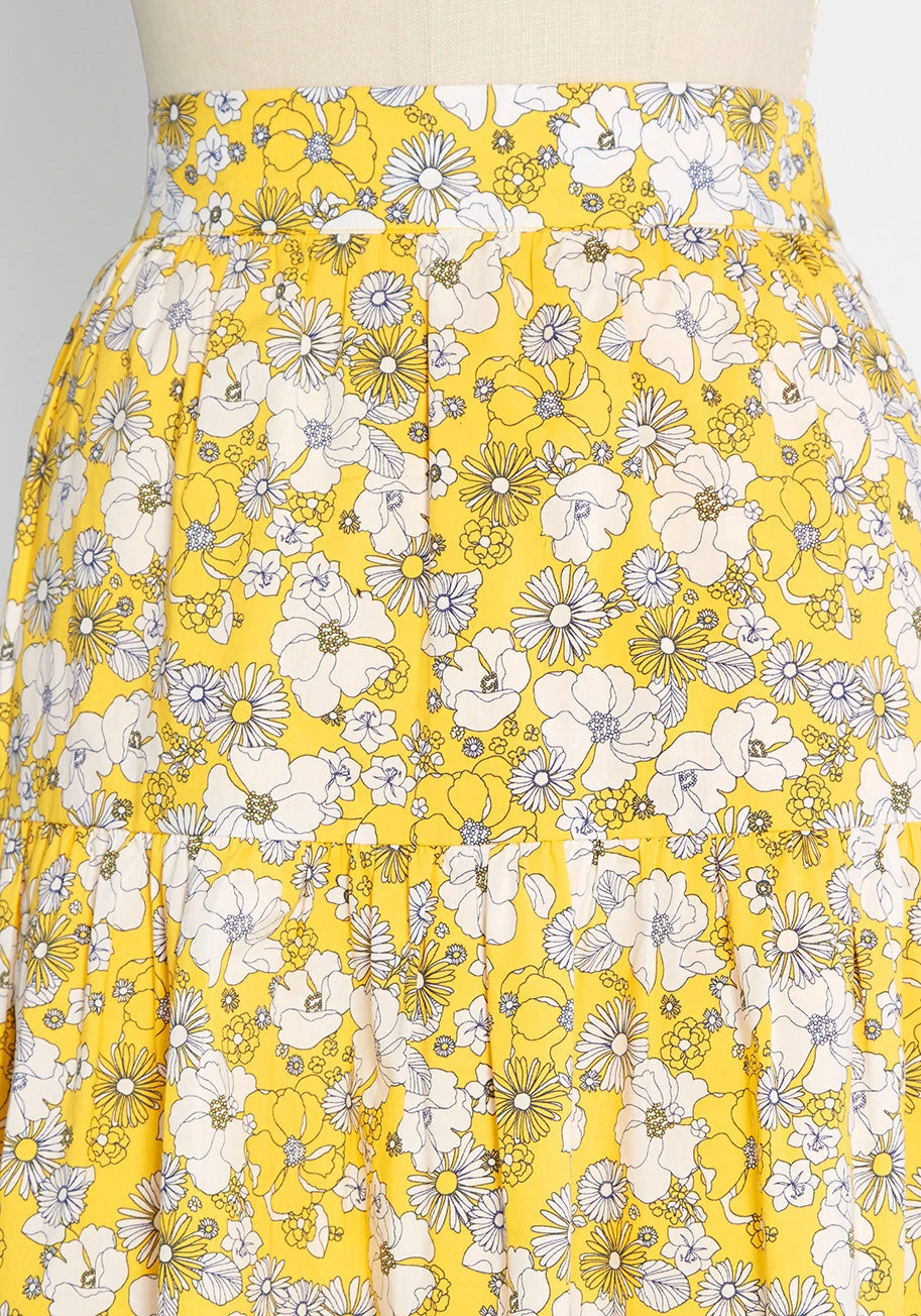 Spin and frolic your spring days away in breezy, timeless style when you rock this ModCloth namesake label skirt. Fully-lined and made from a bright yellow-hued lightweight cotton poplin weave, this high-waisted A-line boasts an exclusive vintage and Western-inspired white and black-hued floral print that was created in-house by our talented design team and exudes dreamy, 70s vibes. A tiered silhouette with a subtle ruffle hem adds flair to this ultra-feminine piece. Perfect for tucking a white crew neck tee into and wearing your fav lightweight cardigan and flats for a quintessential spring ensemble.