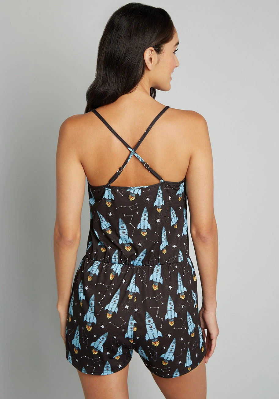 Take it slow, girl, and give yourself some space as you prepare for slumber in this black sleep romper. Whimsically patterned with blue rocket ships blasting amidst the constellations, and crafted from a soft cotton blend, this ModCloth-exclusive loungewear with a V-neck, spaghetti straps that criss-cross at the back, and a drawstring tie-waist band is your go-to choice for instant relaxation.
