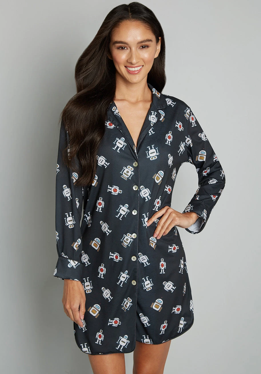 Such a cute and cozy way to ease into your day, wake up in this soft jersey sleep shirt from our ModCloth namesake label. Boasting full front button-up closure, long sleeves with fold-over cuffs, and a V-neckline with a retro-chic notched lapel collar, this black sleep dress features an exclusive hand drawn print of quirky gray robots accented in yellow, red, and blue.