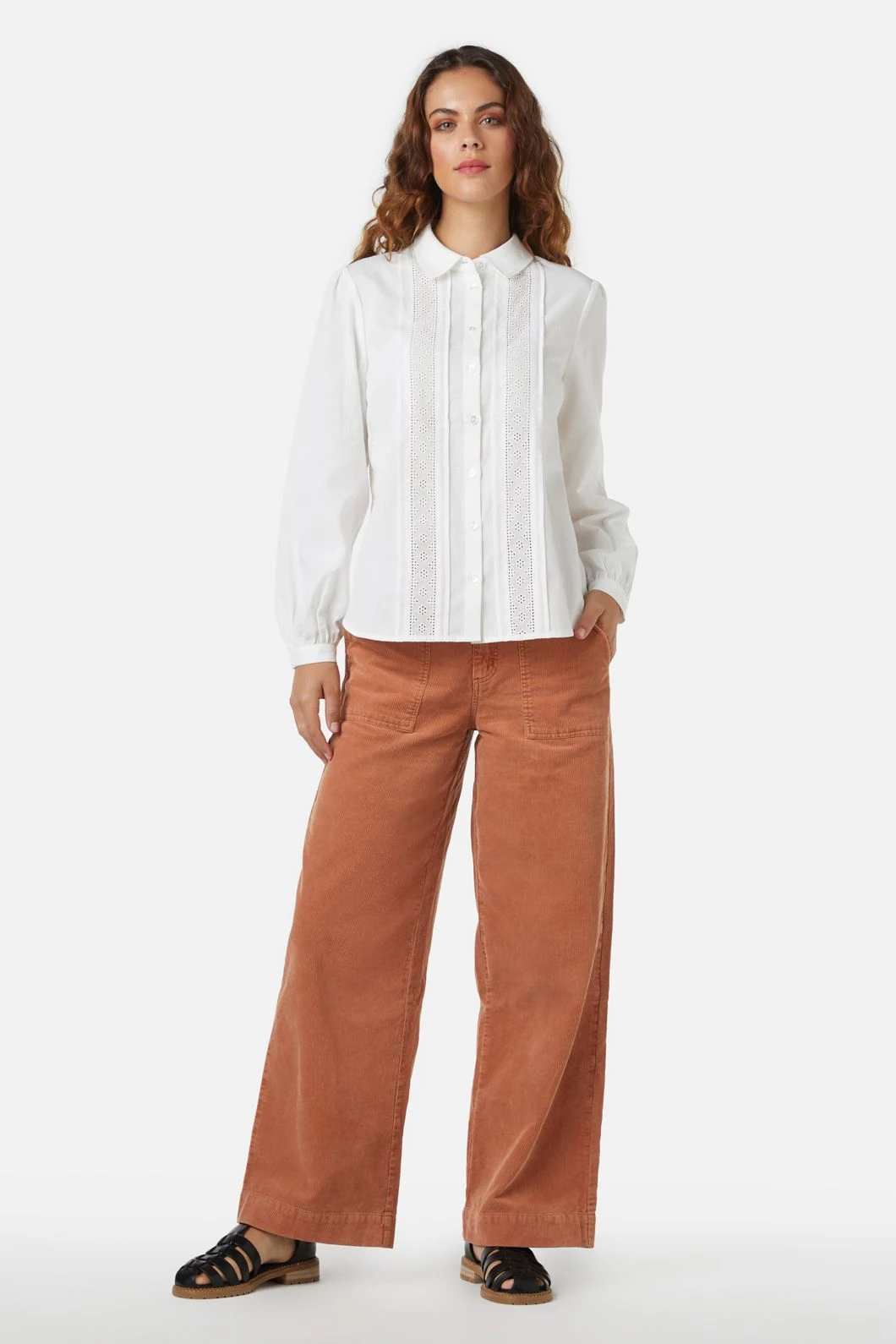 Wrapped in the romance of bygone eras yet fiercely modern, the Emily Blouse whispers tales of elegance with every thread. Let lace trim details, infused with charm in either of two captivating colors, dance lightly around you, embodying grace with a small pointed collar that speaks volumes of understated chic. Unveiling a tale of comfort and style, its long sleeves bloom into button-up cuffs, marrying form with function. The button-through front offers a flirtatious wink to classic designs, while the textured cotton fabric embraces your form, ensuring every moment is a testament to timeless sophistication. The Emily Blouse isn’t just a garment; it’s a love affair with fashion.