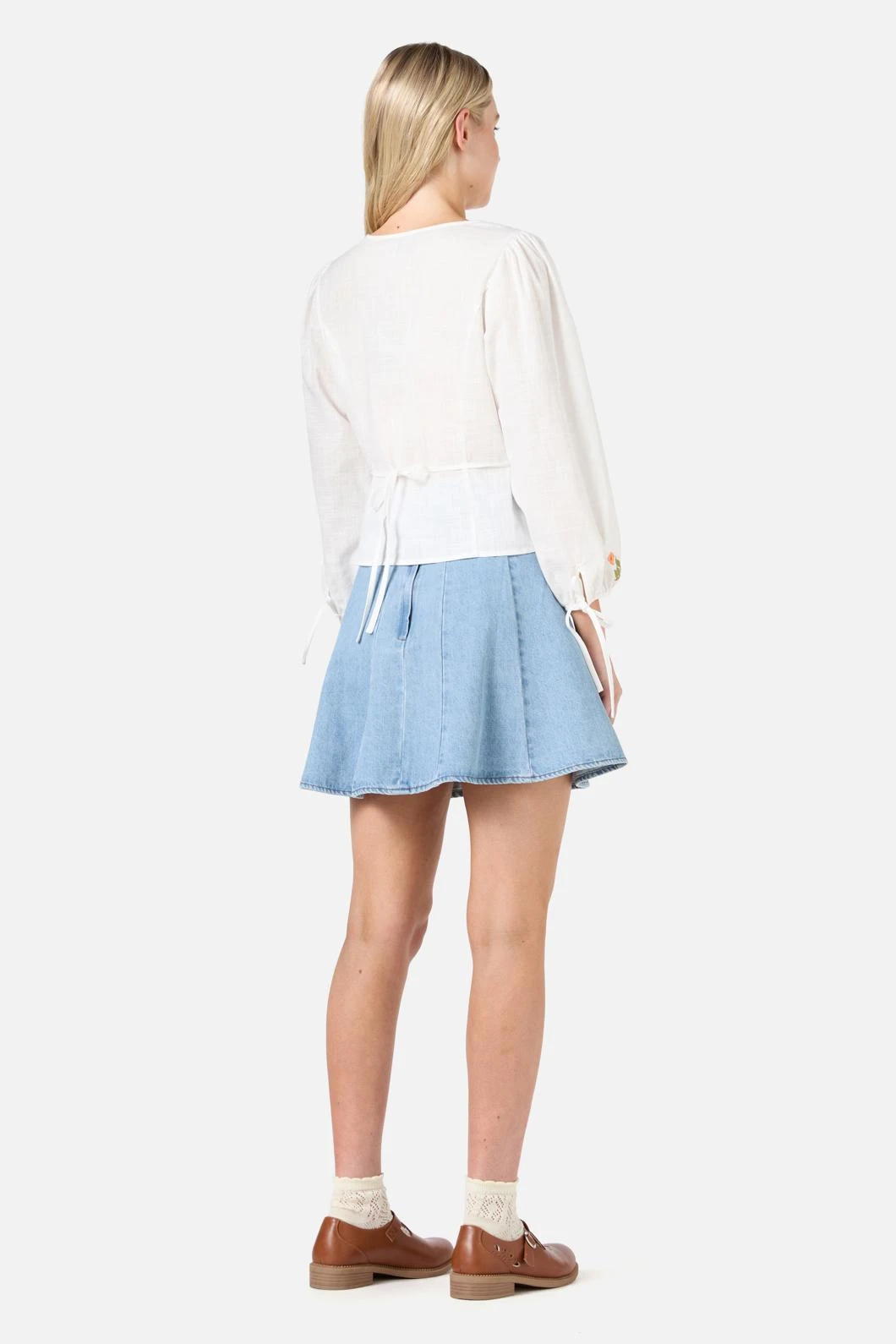 - Sleeves: Long sleeves with tie cuffs