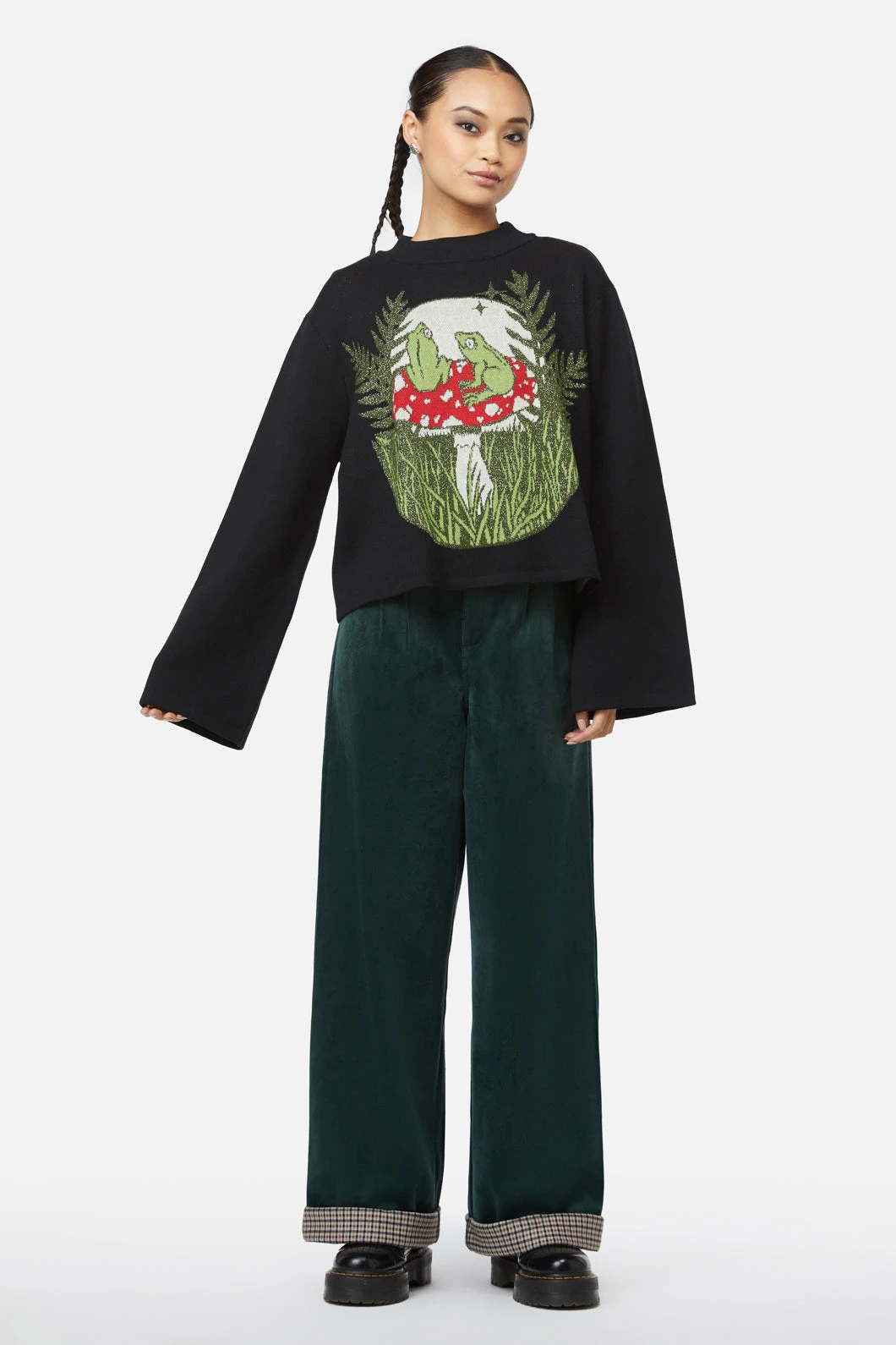 Hop into cozy charm with the Frog Friends Knit Cardigan by Black Friday! This delightfully playful intarsia knit design features a group of whimsical frog friends, brought to life with a glittery effect that adds a little extra sparkle to your day. The mock neck cut and wide-hem sleeves give this piece a vintage-meets-modern twist, perfect for layering over your favorite outfits.Â