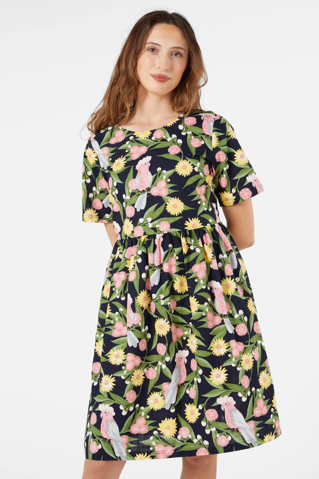 Galah Smock Dress by Princess Highway – A breezy navy smock dress featuring a charming galah and gumnut blossom print, perfect for effortless everyday wear.