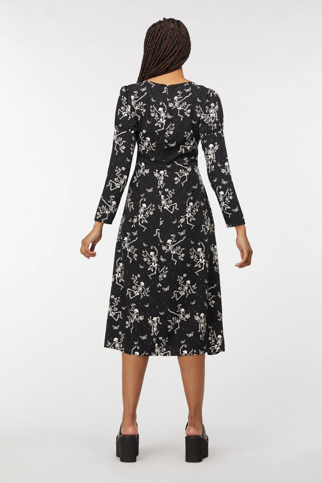 Designed with a fitted bust and a flared skirt that falls to a midi length, this dress exudes timeless femininity with a dark twist. The soft viscose fabric ensures comfort and flow, making it an ideal choice for both casual and special occasions.Â