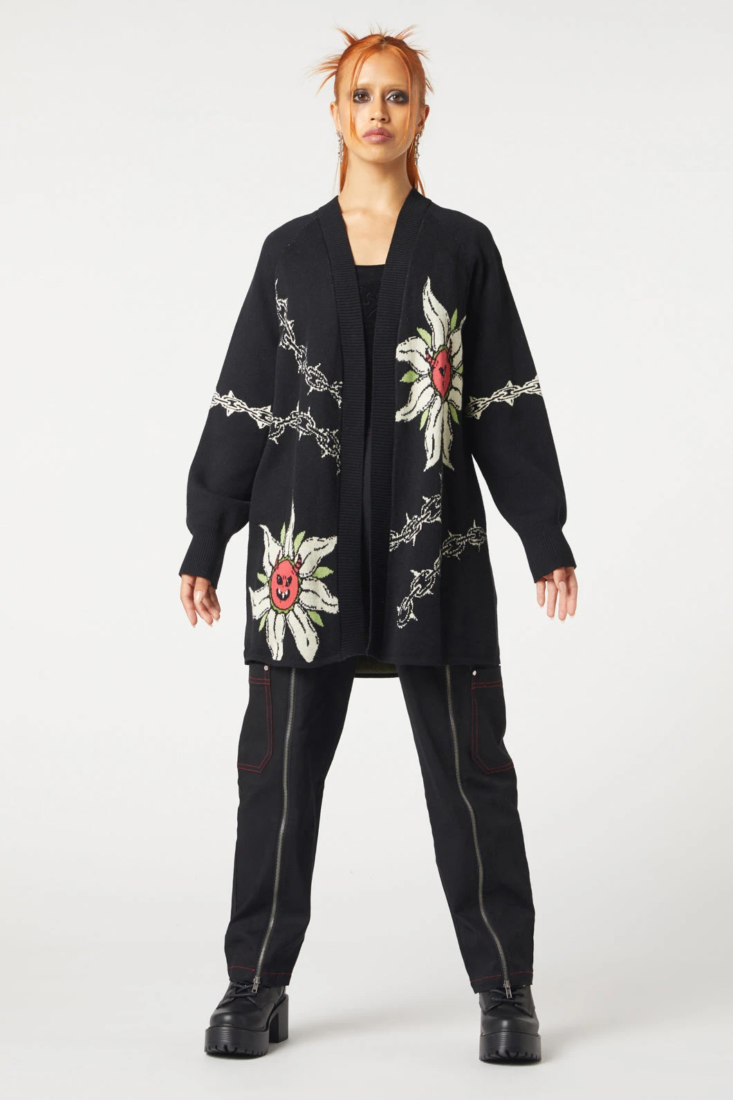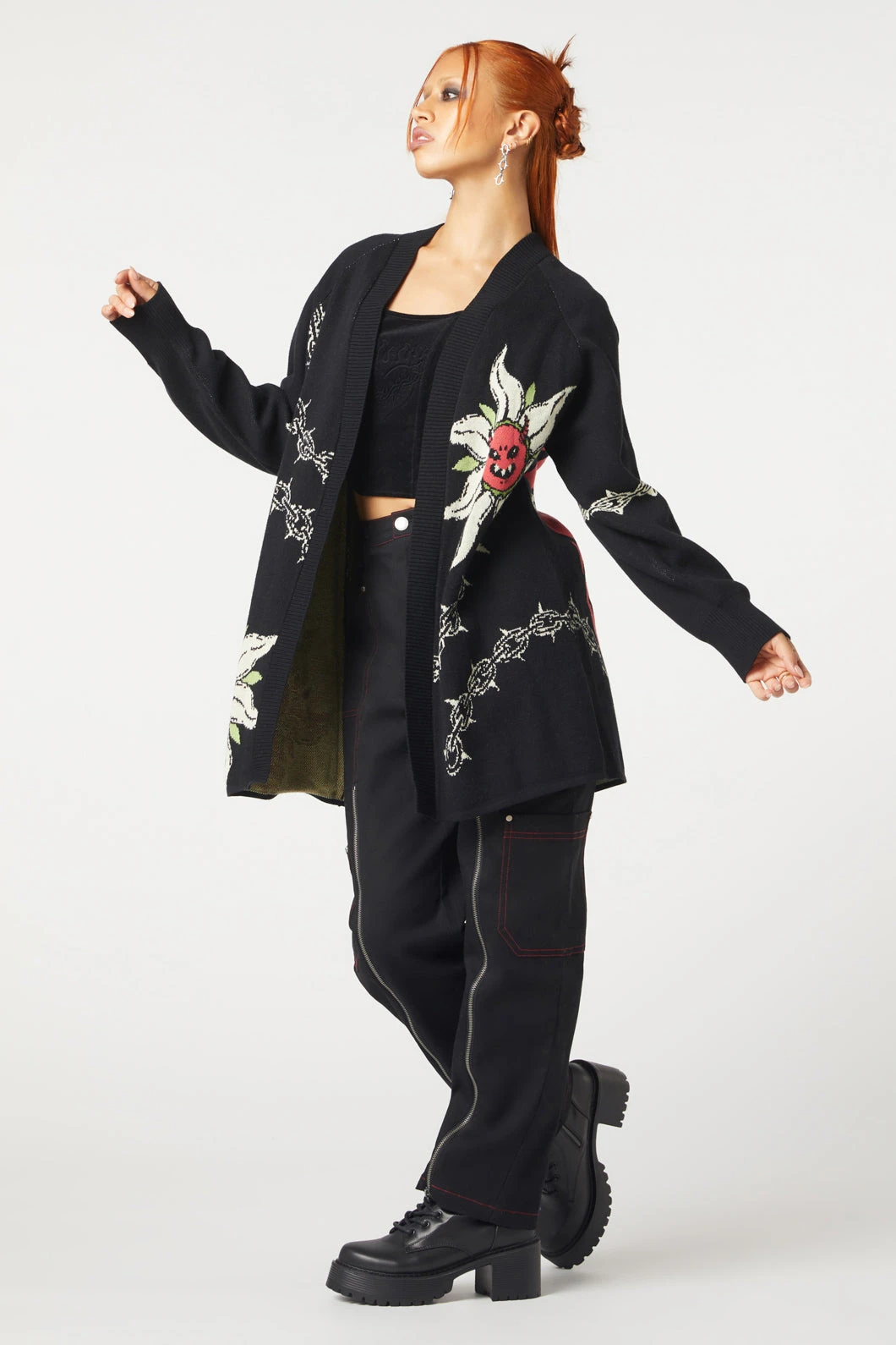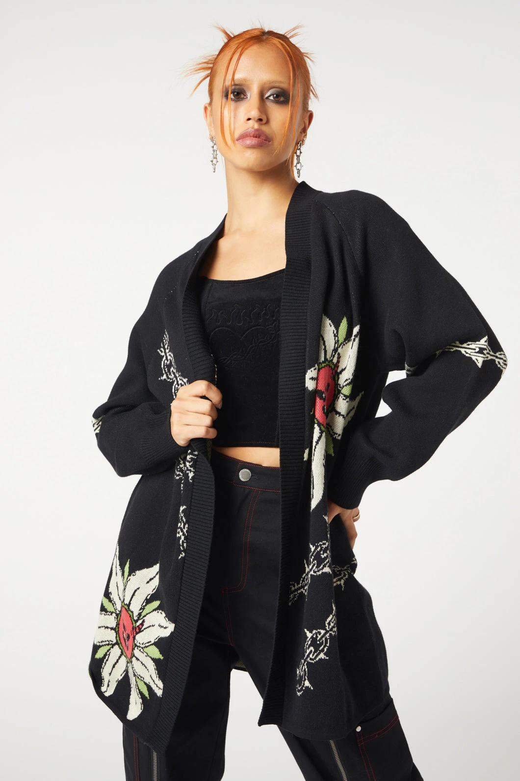 Set against a deep black base, this cardigan features charming golden retriever placement artwork prominently displayed on both the front and back. The design is elevated by contrasting rib knit at the neckline and hems, providing a subtle textural pop to its relaxed silhouette.