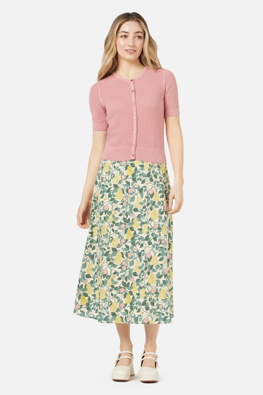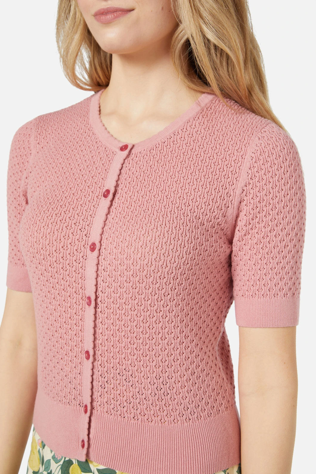 The Isla Cardi offers a charming lace-style knit in a cotton yarn, making it a breathable and versatile piece for any wardrobe. This short-sleeve cardigan features a rounded neckline, button-through front, and ribbed detailing on the neck, cuffs, and hem. Designed with a comfortable amount of stretch, it’s perfect for layering over dresses or pairing with high-waisted pants. Available in olive and pink.