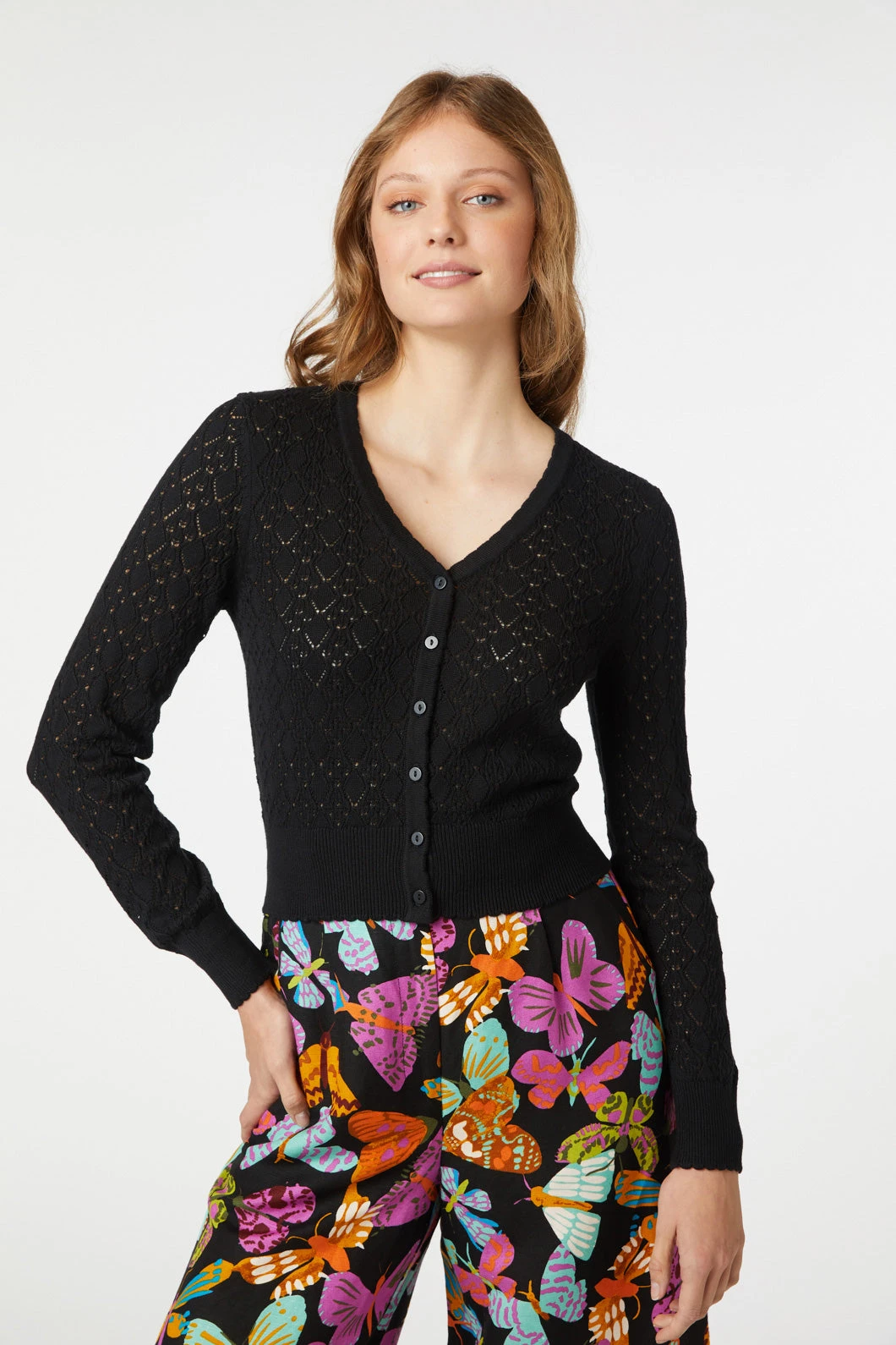 Introducing the Lace Knitted Cardi from Princess Highway, a piece that whispers nostalgia with a modern twist. Available in the dreamiest lilac and a sleek black, this cardigan wraps you in a nostalgia that feels just right for now. The long sleeves and V-shaped neckline create a silhouette that’s as flattering as it is comfortable, inviting you to layer it in countless ways. With delicate ribbing at the sleeves and hem, this cardi adds a subtle textural contrast that elevates any outfit. Crafted in a soft acrylic cotton blend, it promises to keep you cozy without compromising on breathability. Whether you’re dressing up for a coffee date or layering over a dress for an evening soiree, this cardigan bridges the gap between whimsical charm and practicality. It’s the knitwear piece you’ve been dreaming of, ready to accompany you on every errand, adventure, and cozy moment in between.