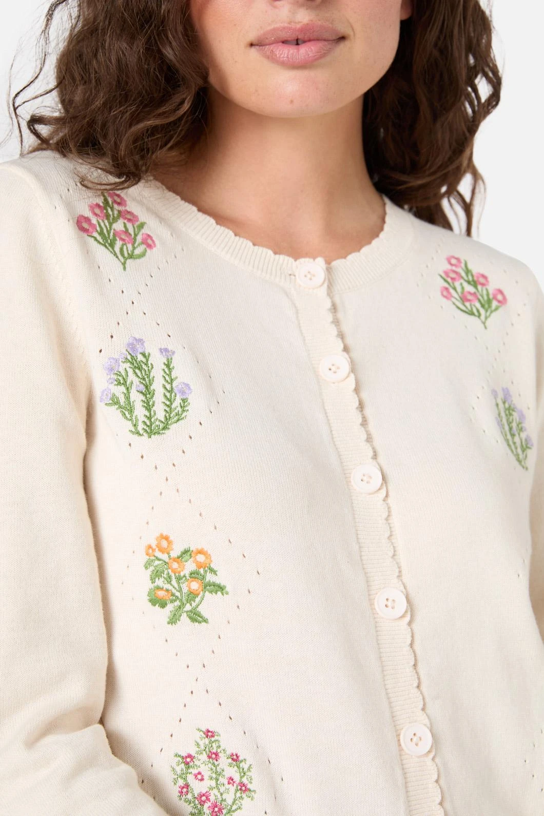 A romantic long-sleeve cardigan featuring delicate diamond knit details and colorful meadow flower embroidery, perfect for adding a touch of vintage charm to any outfit.