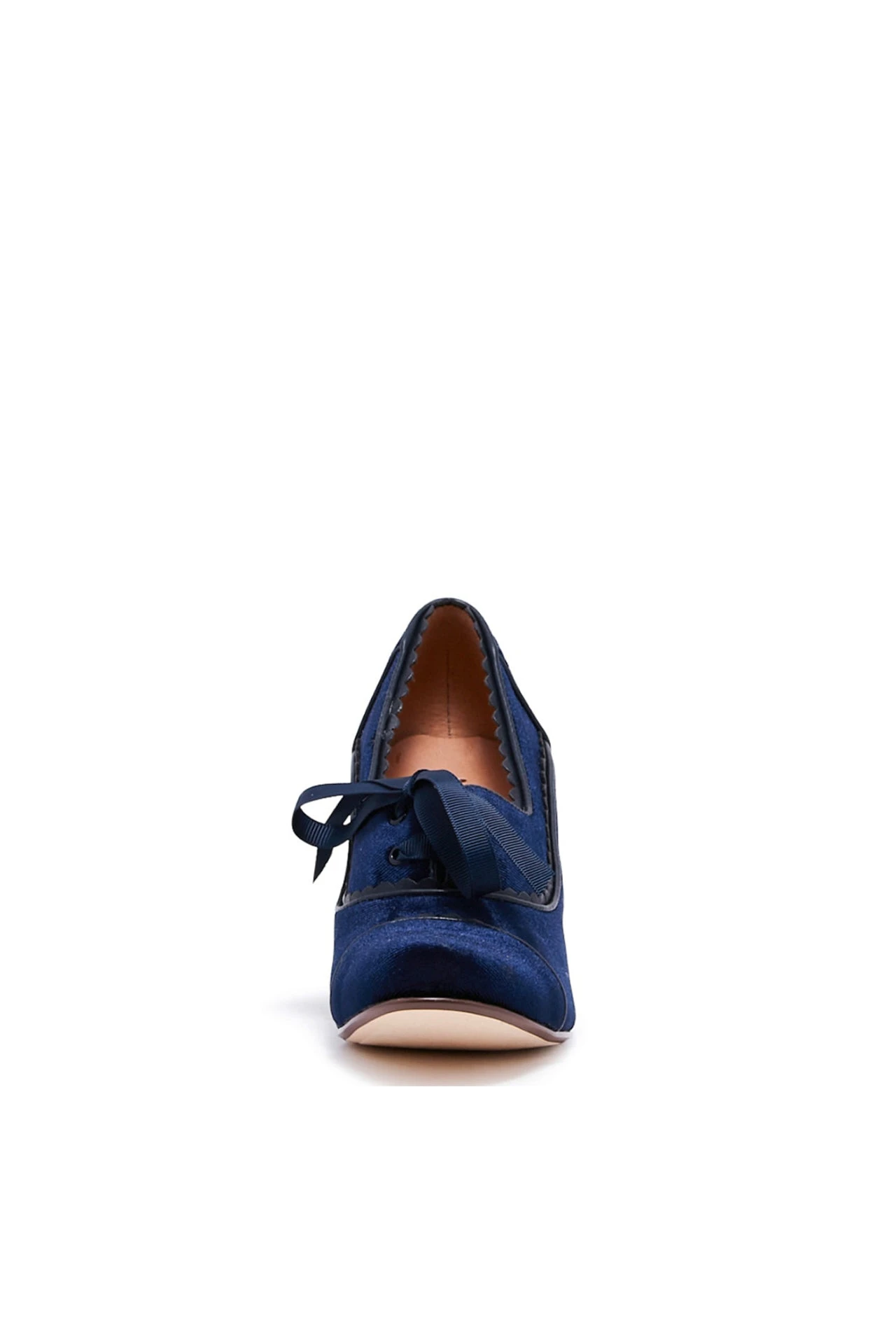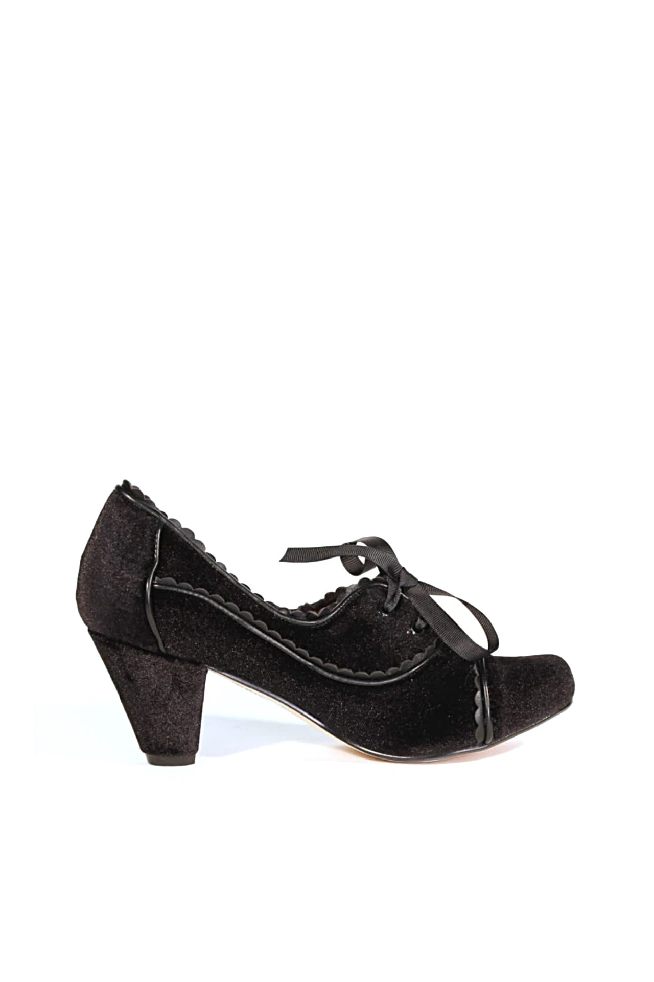 Trendy oxford inspired heel by Chelsea Crew with a scalloped low cut collar. Ribbon lace ties make this shoe extremely flirtatious with a very girly twist.