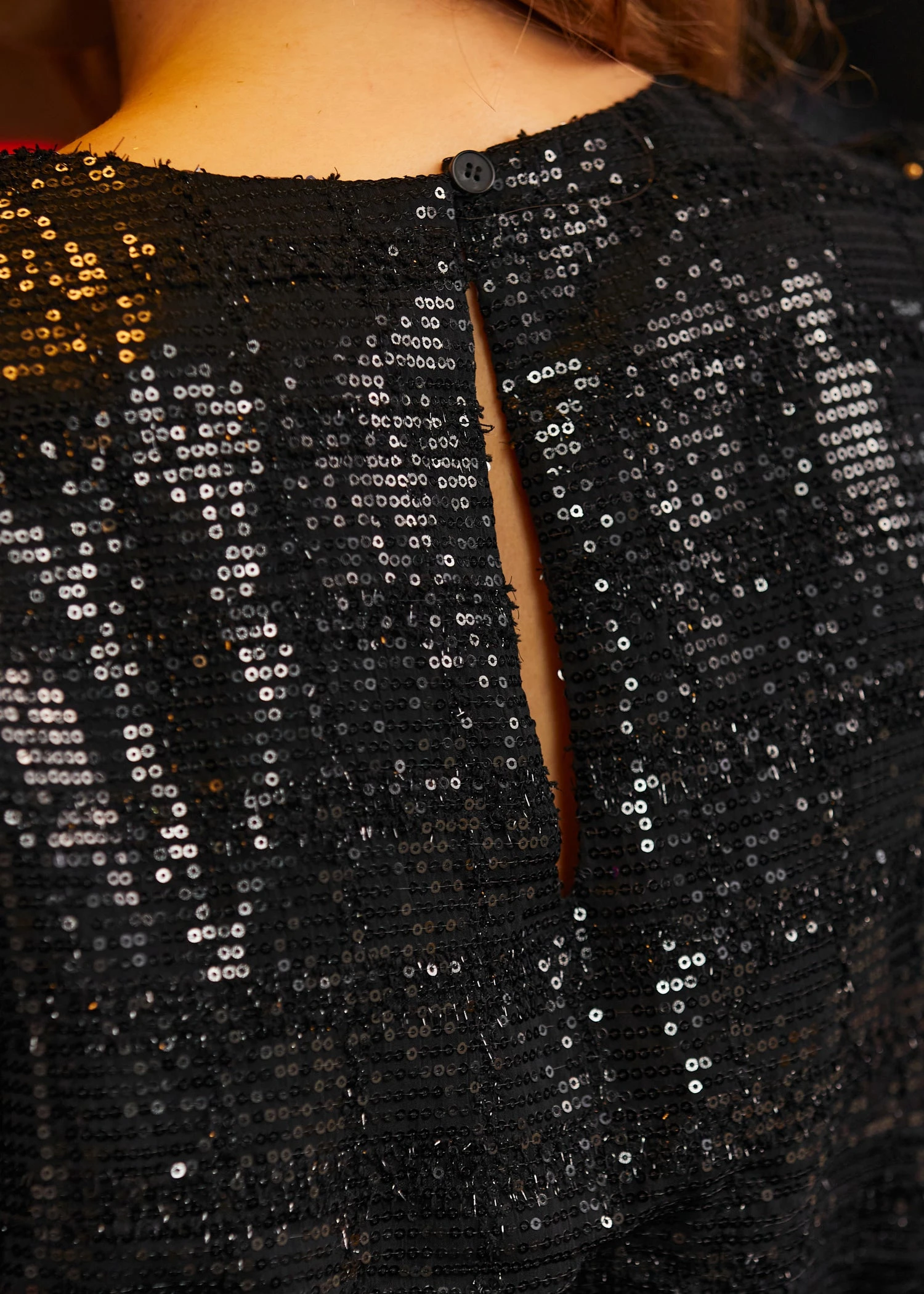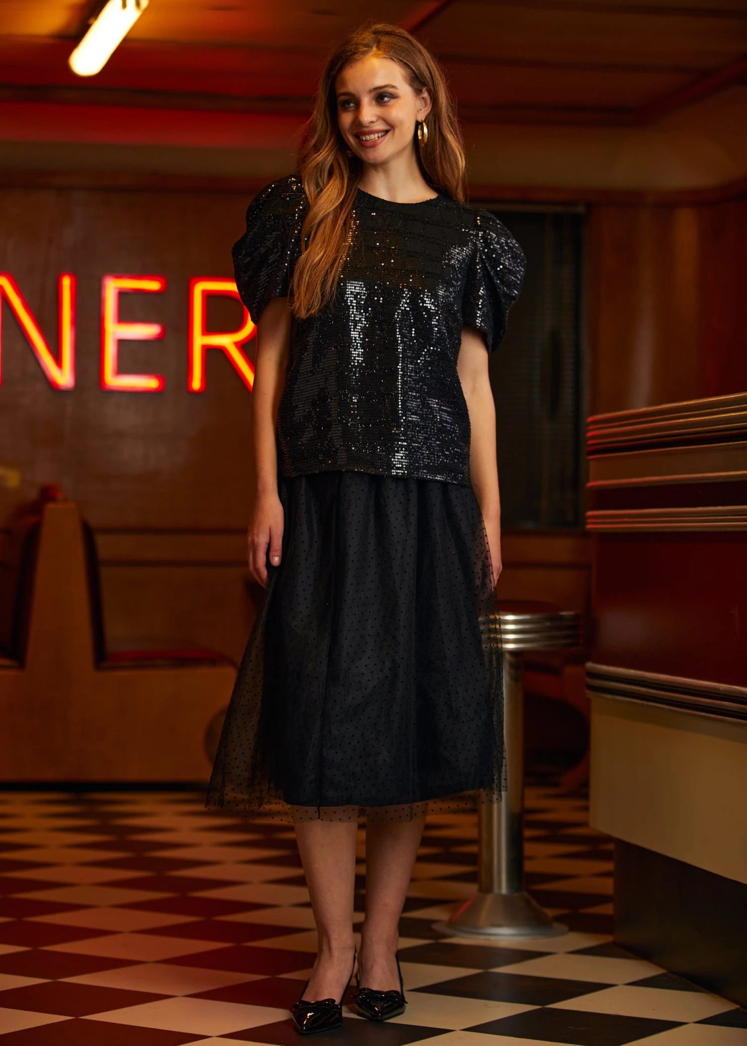 Visual Details: This top features a sophisticated deep midnight black hue that provides a canvas for its standout architectural bubble sleeves. The voluminous puff design creates a striking silhouette against the classic, streamlined crew neckline, making it a perfect statement piece for the season.