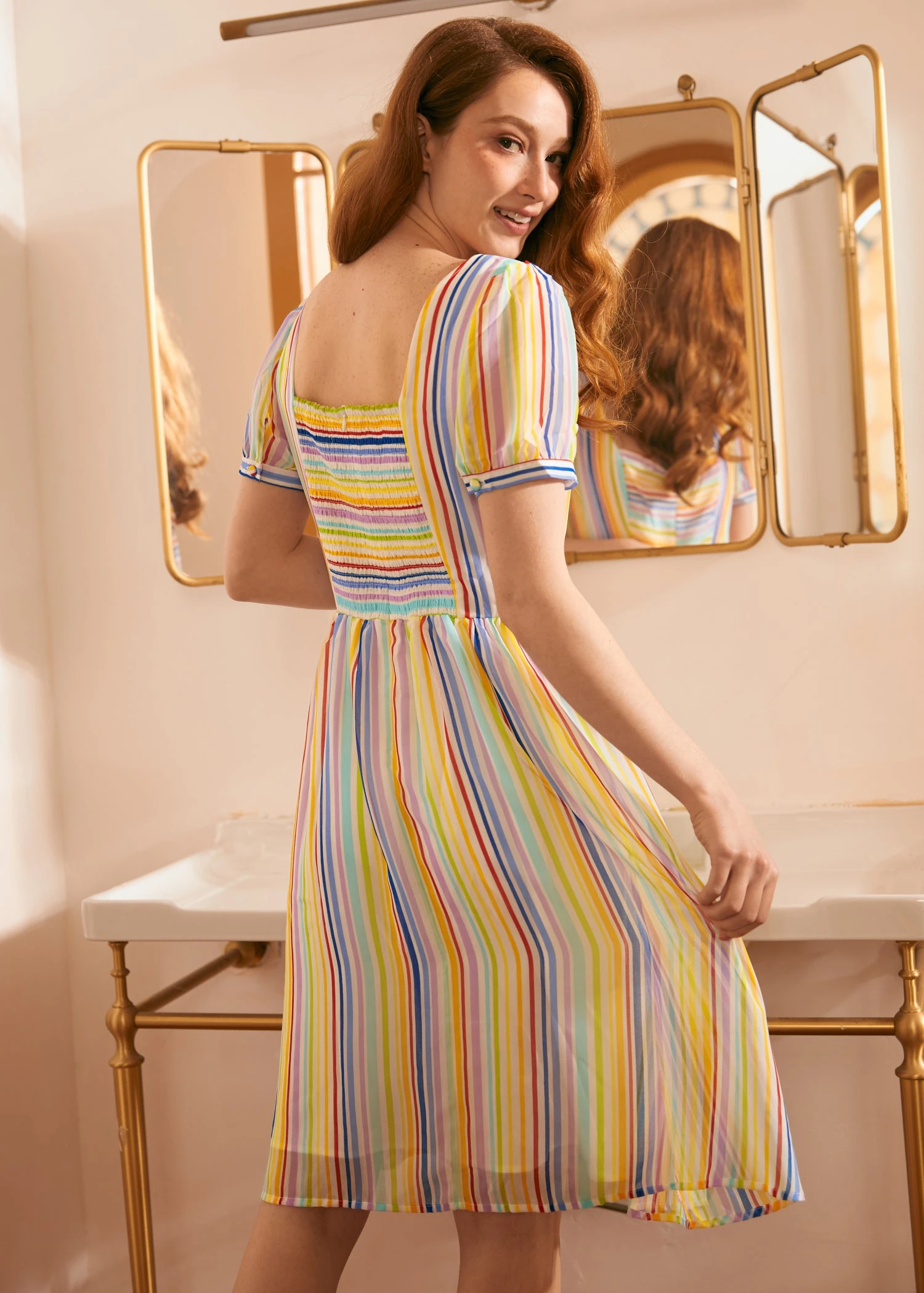 The dress showcases a darling sweetheart neckline and short puff sleeves finished with elegant button closures at the cuffs. The fitted bodice features a clever smocked back panel to ensure a flexible, tailored fit for all-day comfort. The voluminous gathered flare skirt hits at the knee, featuring a semi-sheer overlay that adds an airy, feminine touch to every movement.