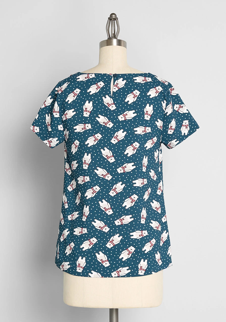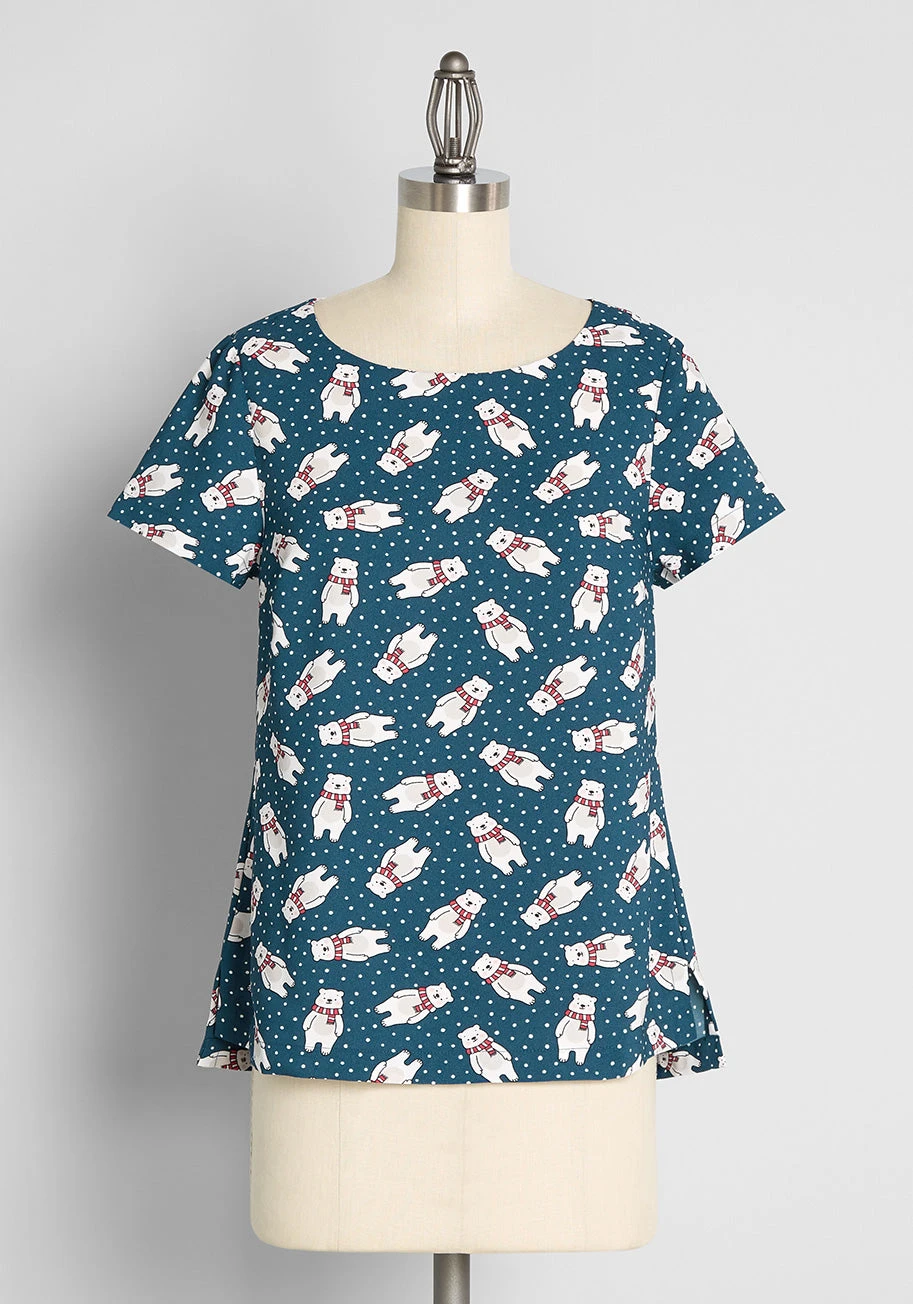 Set against a deep navy blue background, this blouse features an exclusive holiday print of adorable polar bears bundled up in red-and-white striped scarves. White speckled dots are scattered throughout, mimicking a gentle winter snowfall. The design is finished with classic short sleeves and a delicate back keyhole with a button closure, offering a lightweight and jolly silhouette.