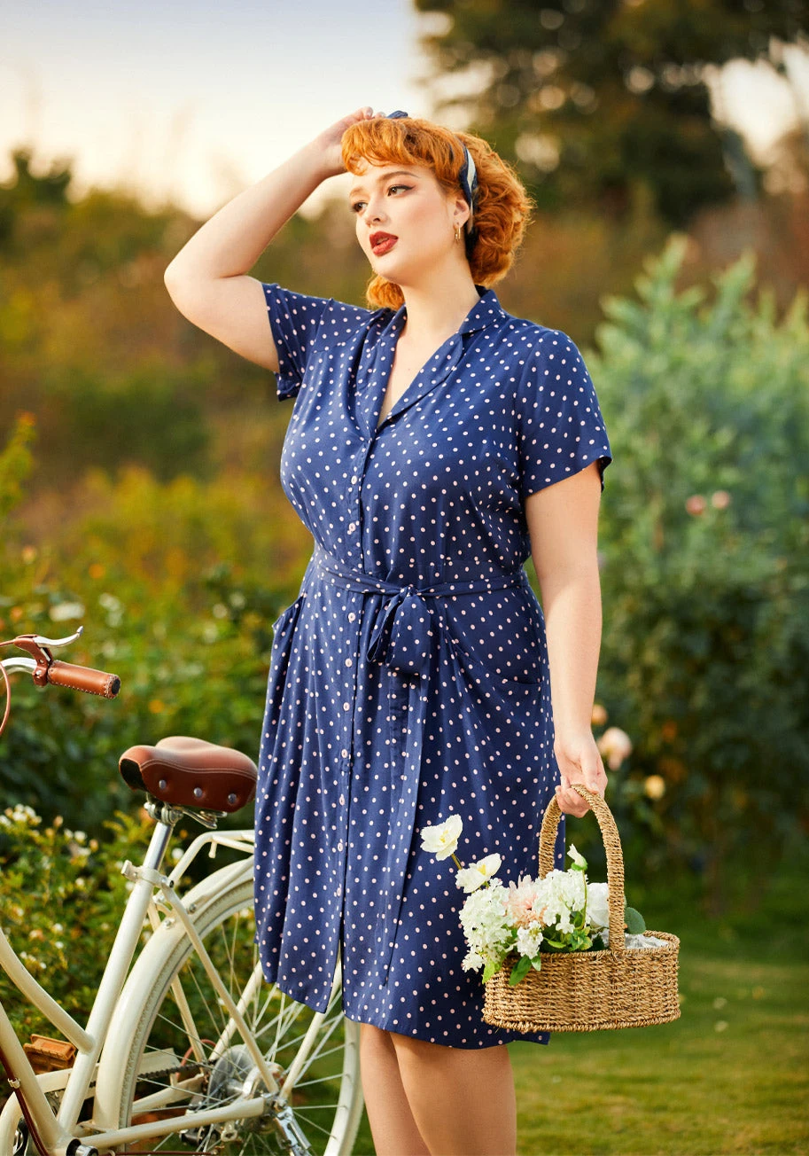 - Style: 1940s-inspired house dress in Navy Blue and Pink Polka Dots.