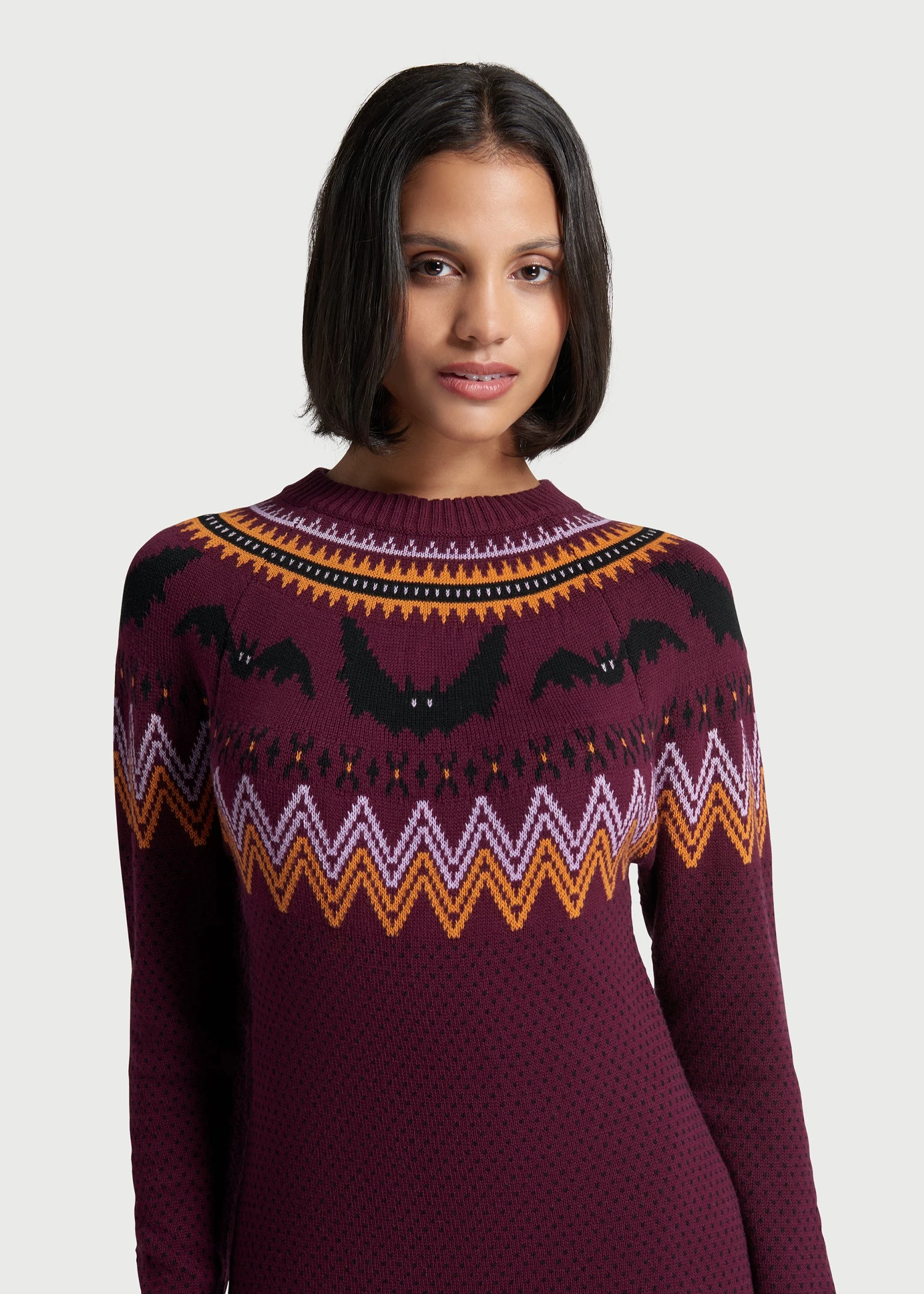 - Unique Visuals: Exclusive Fair Isle bat pattern yoke with contrast geometric accents and all-over polka dots.