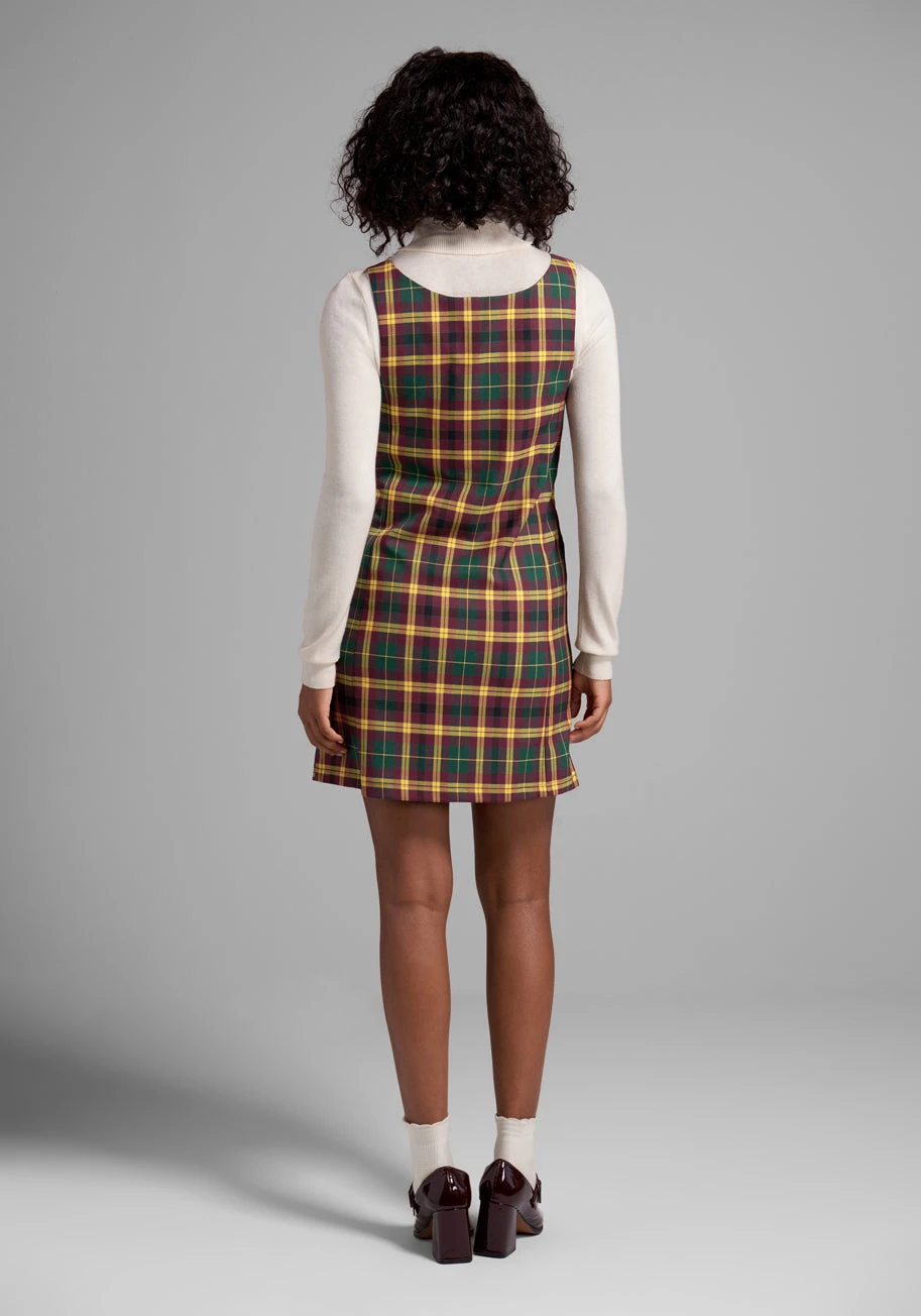Step back into the golden era of style with the She’s So Retro Shift Dress from our ModCloth namesake label. This exclusive piece features a rich, earthy plaid print composed of mustard yellow, hunter green, and deep burgundy tones, offering a timeless vintage aesthetic. Crafted from a stretchy woven fabric, this sleeveless shift dress provides both comfort and a structured look.