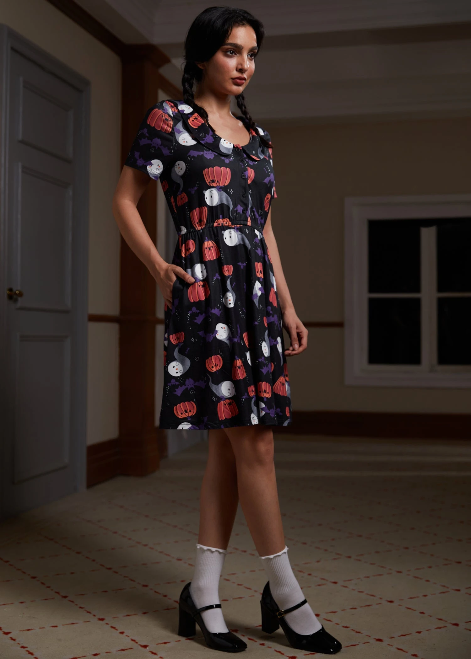 - Design: All-over Halloween festive print with functional button closure.