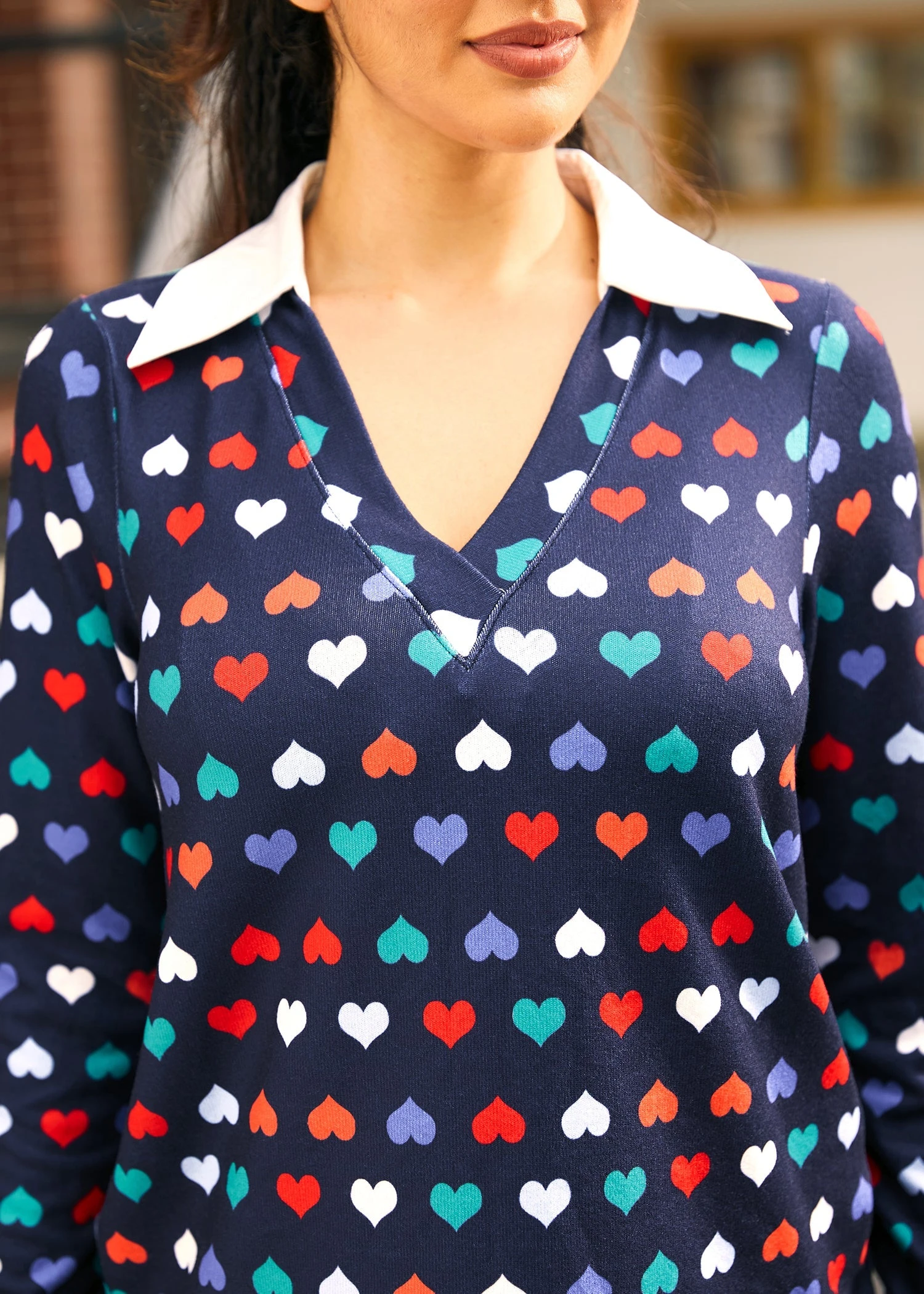 - Visual Details: Features an all-over joyful rainbow heart print on a high-quality knit base.
