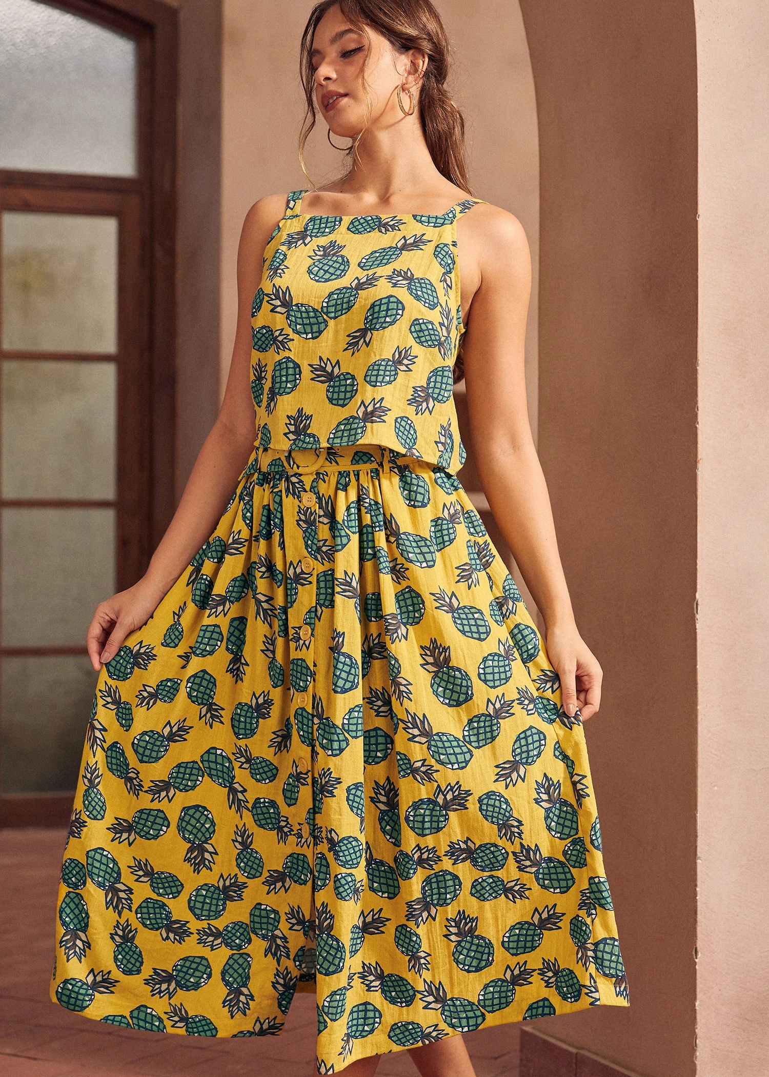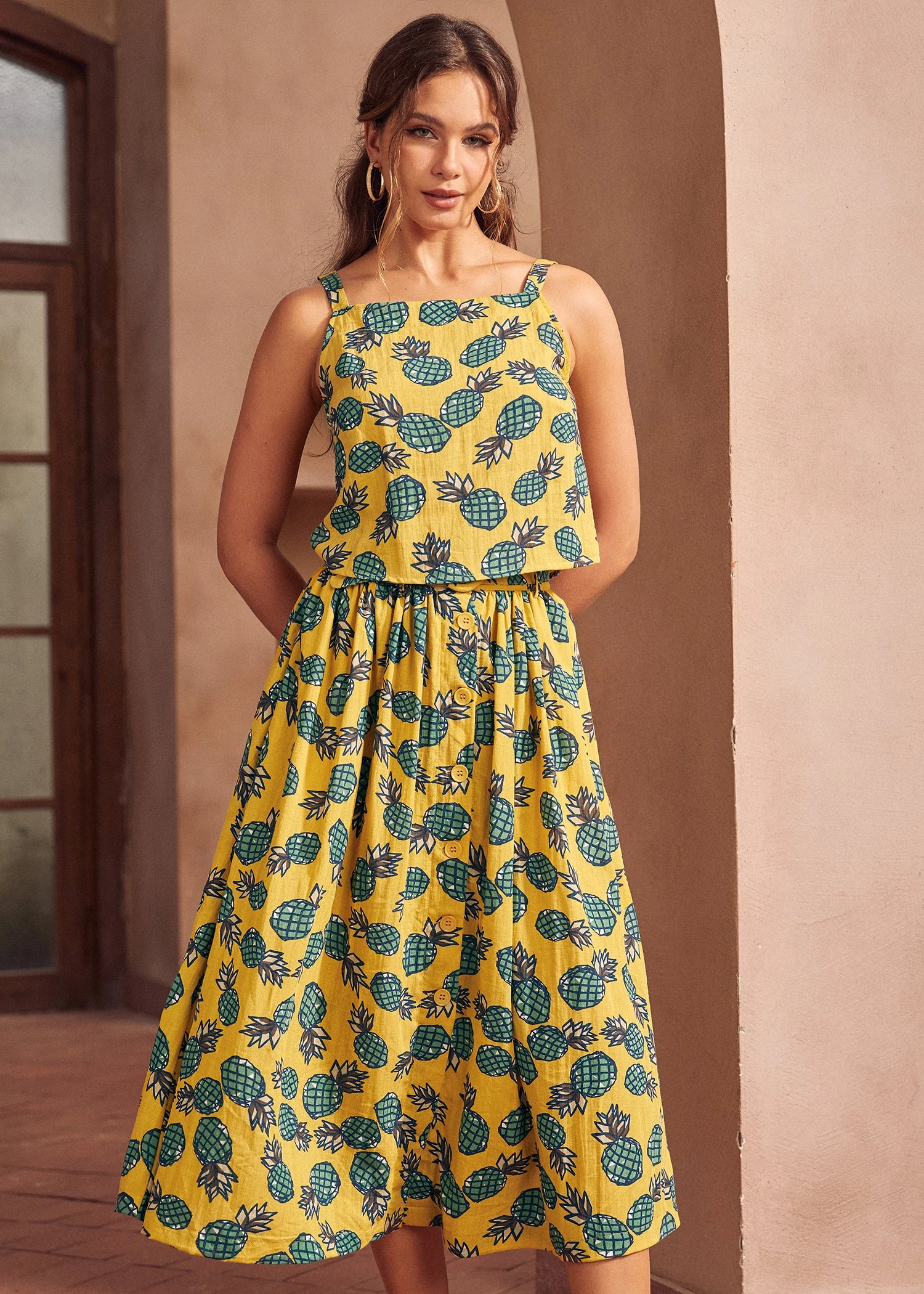 This top showcases a vibrant all-over yellow pineapple motif set against a crisp white background. The feminine silhouette is enhanced by delicate spaghetti straps and a unique, sophisticated row of buttons running down the back for a touch of unexpected charm.