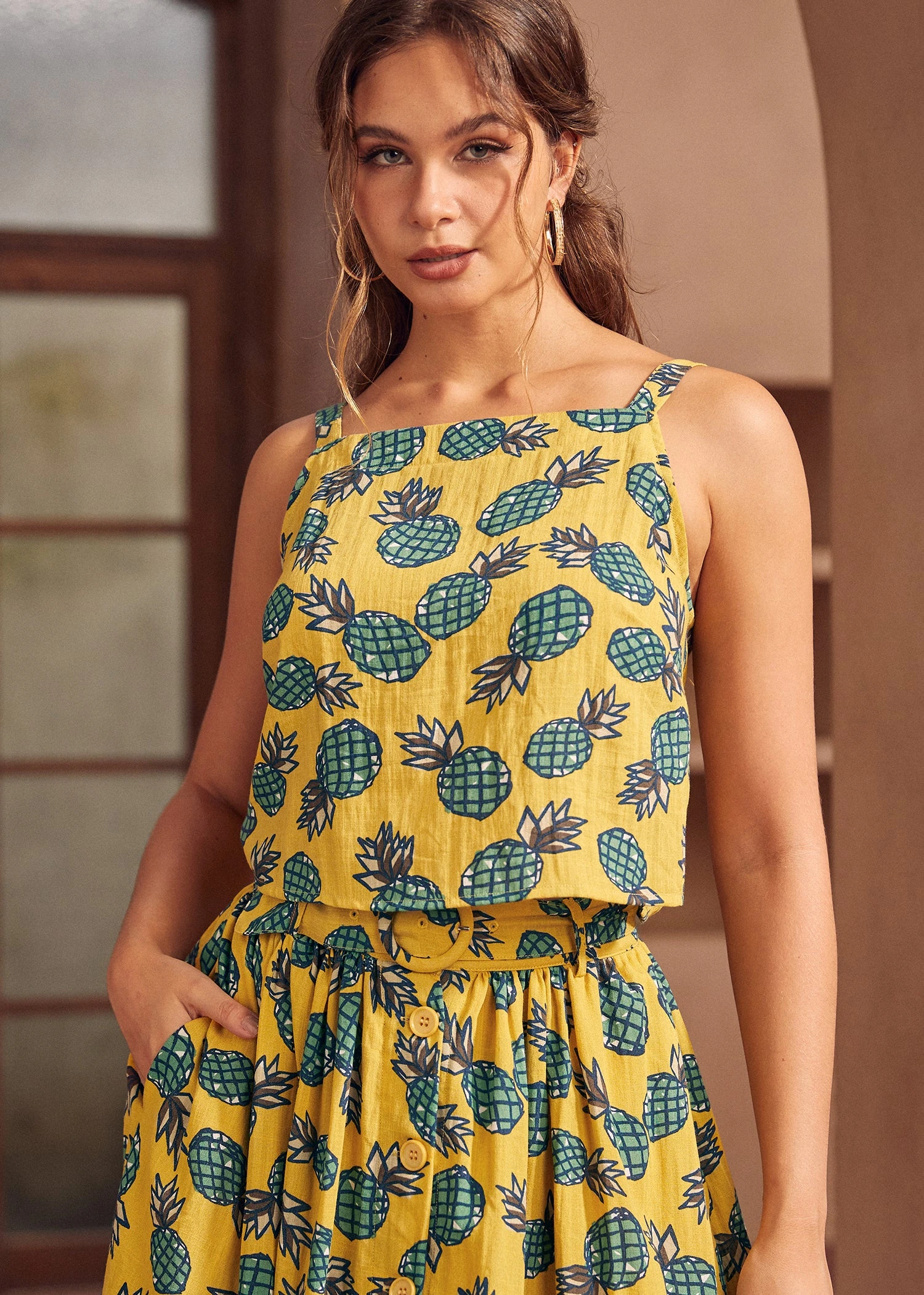 Dive into summer’s sweet embrace with the Morning Melody Top, a playful pineapple print tank that captures the essence of tropical escapes. Crafted from a breezy, lightweight fabric blend, this piece is designed for maximum comfort during sun-drenched days and balmy nights.