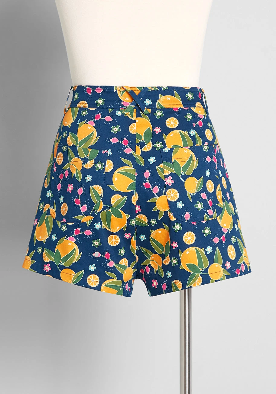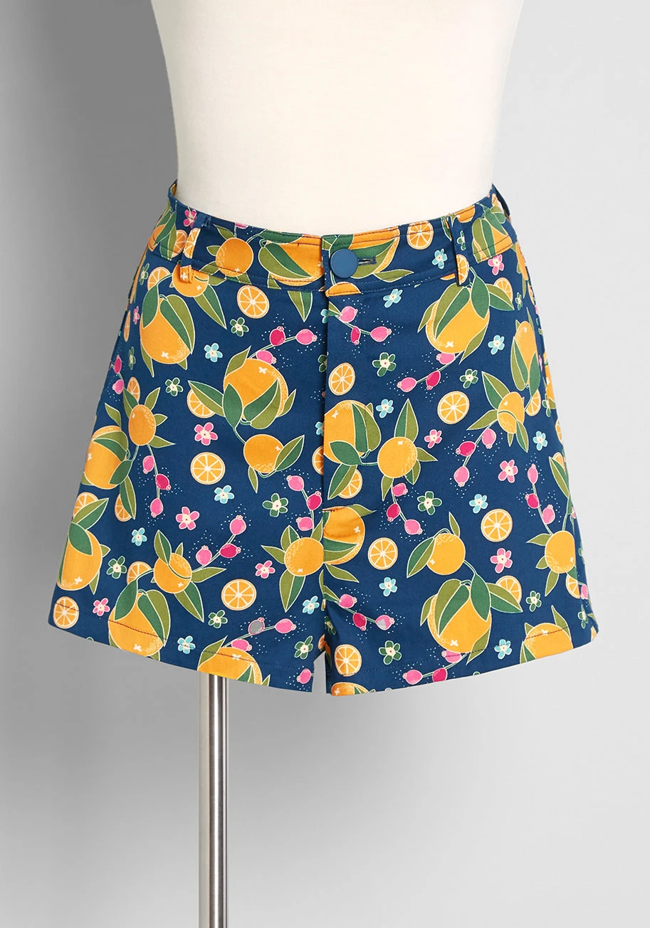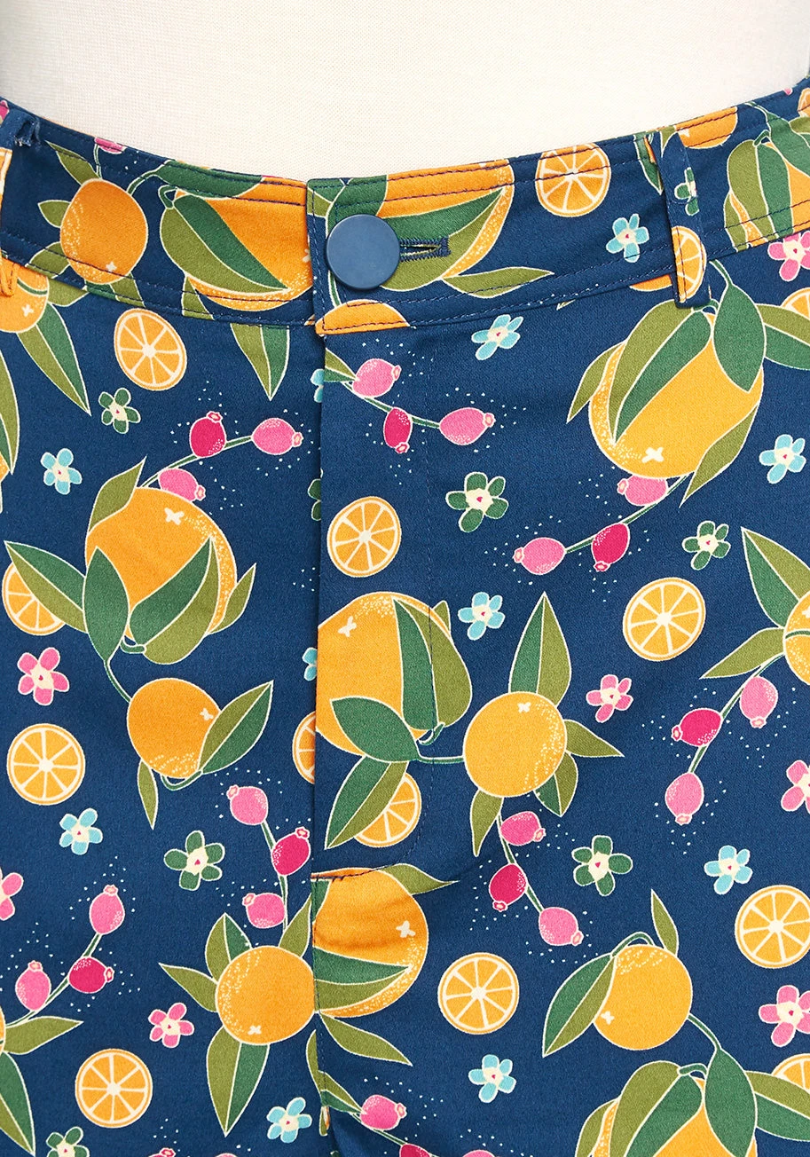 Celebrating warm summer breezes filled with the sweet scent of orange blossoms, these adorable navy blue shorts from UK brand Bright and Beautiful are covered throughout in ripe oranges surrounded by pink, blue, and green floral blossoms. Made from a slightly stretchy woven fabric, these retro-chic bottoms boast a high-rise waist and handy front and back pockets.