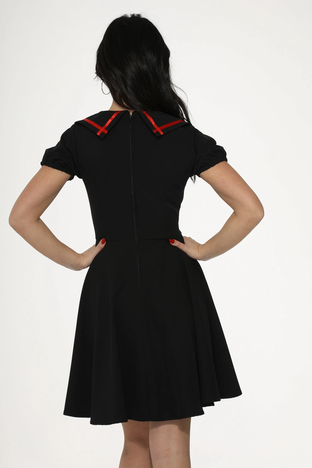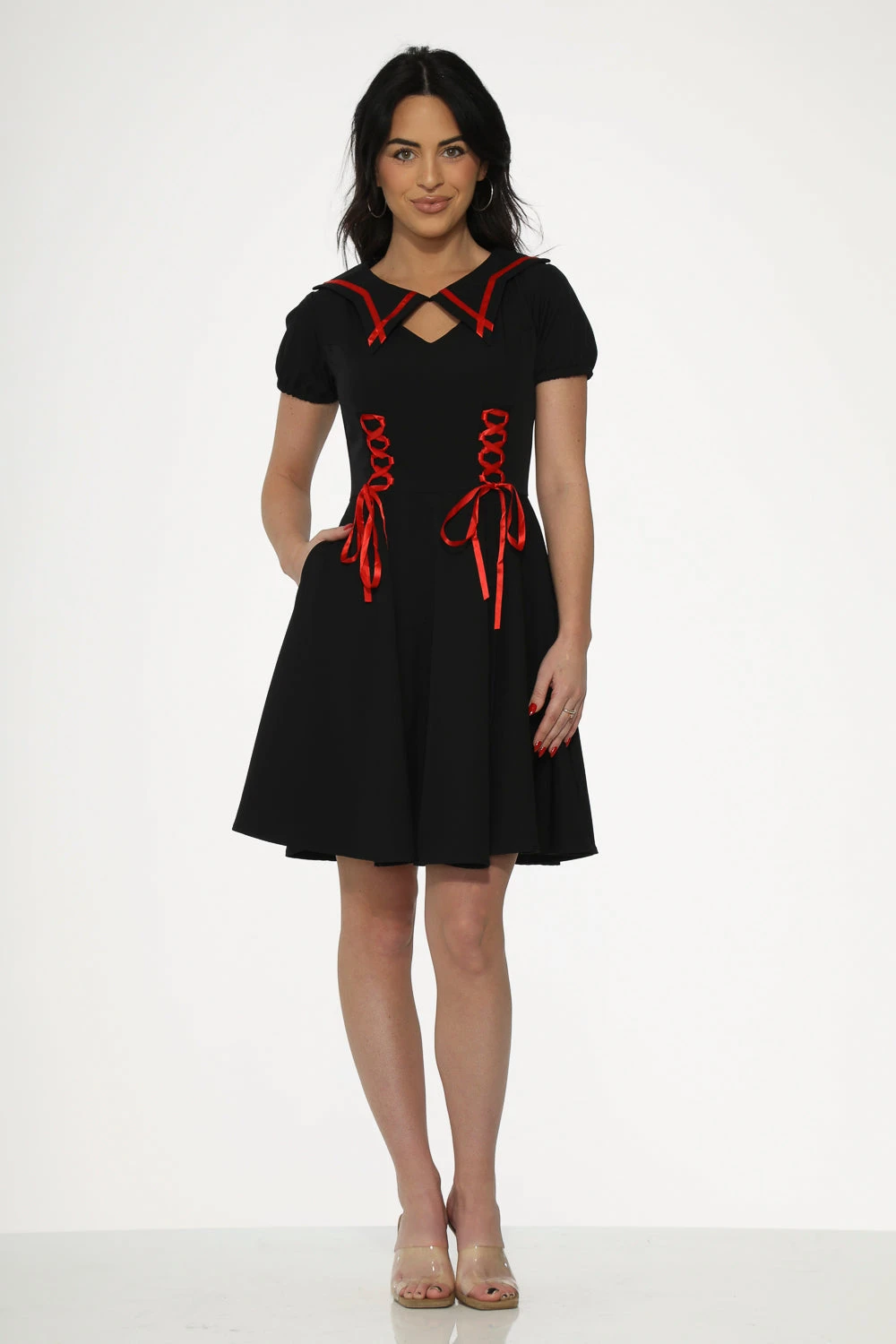 The dress showcases a high-contrast red trim that highlights the neckline and the full, flared swing skirt. Designed for both style and utility, it includes discreet side pockets and a sleek back zipper for a seamless fit.