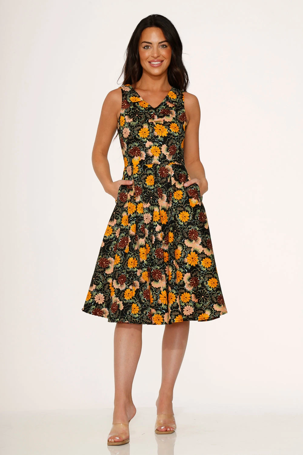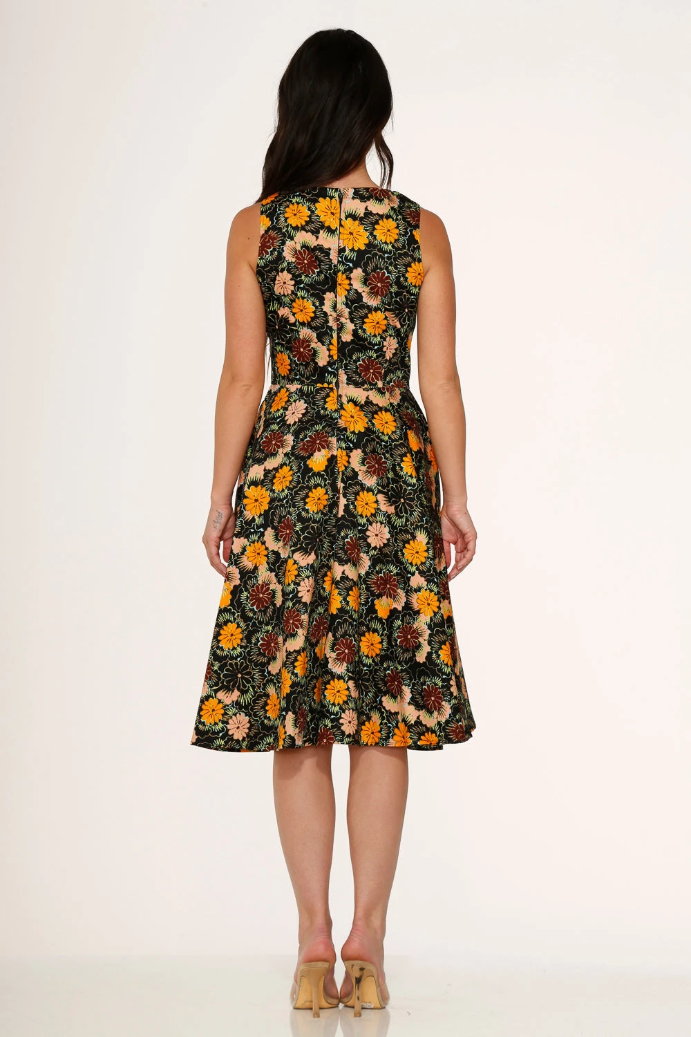 Designed with a classic swing silhouette, this midi dress offers a flattering A-line shape that moves beautifully. The cheerful yellow hue is complemented by intricate, multi-toned floral details, making it a standout choice for any daytime occasion. The structured bodice and flowing skirt provide a vintage-inspired look that remains modern and chic.
