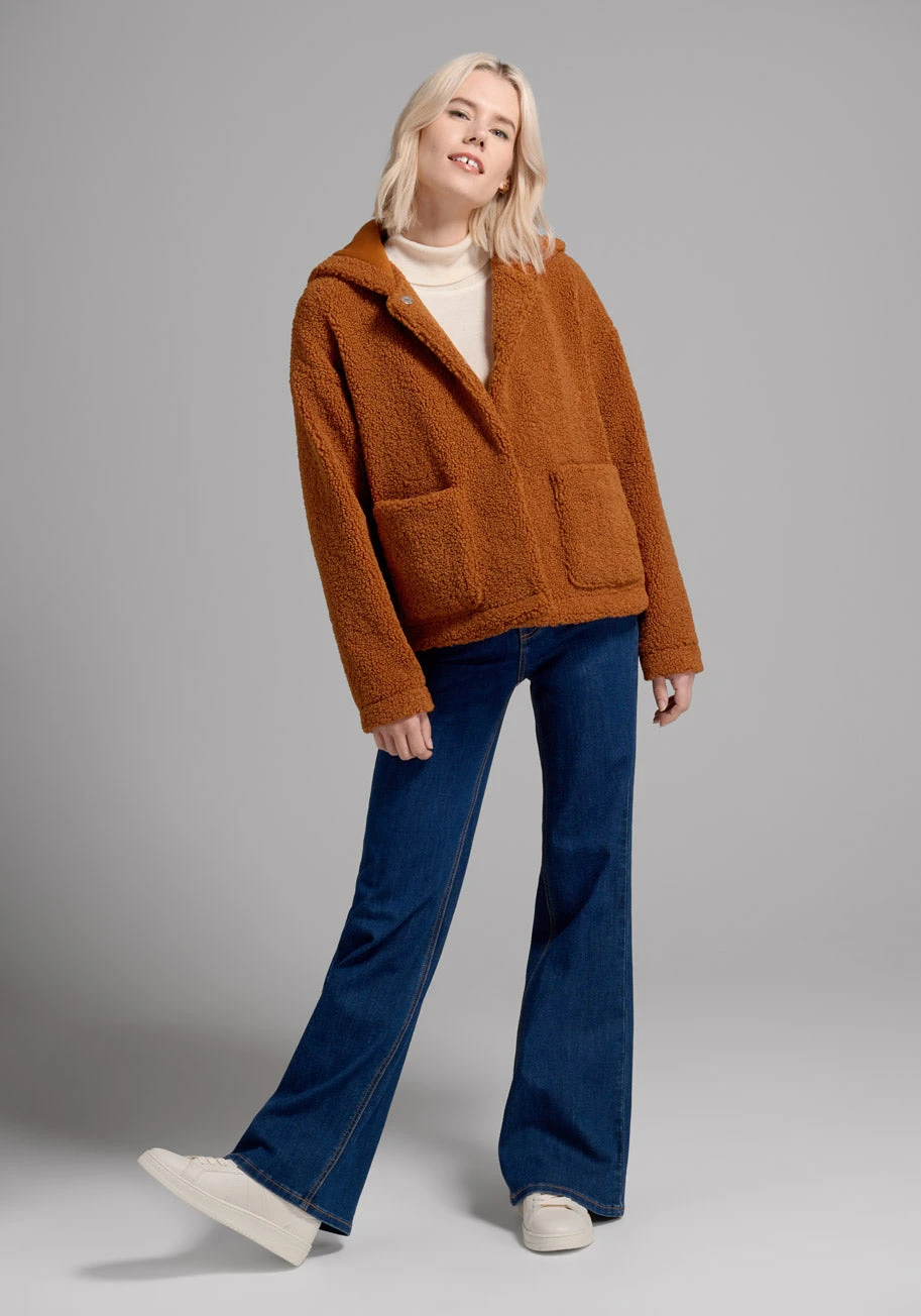 In a cinnamon-y shade of orange, this oh-so-cozy hooded jacket will keep you bundled up in retro-chic style! Made from a plush sherpa fabric and boasting front snap-button closure, handy front patch pockets, long sleeves, and a snuggly hood, this adorable, fully-lined teddy coat will become the outerwear you never want to take off.Â