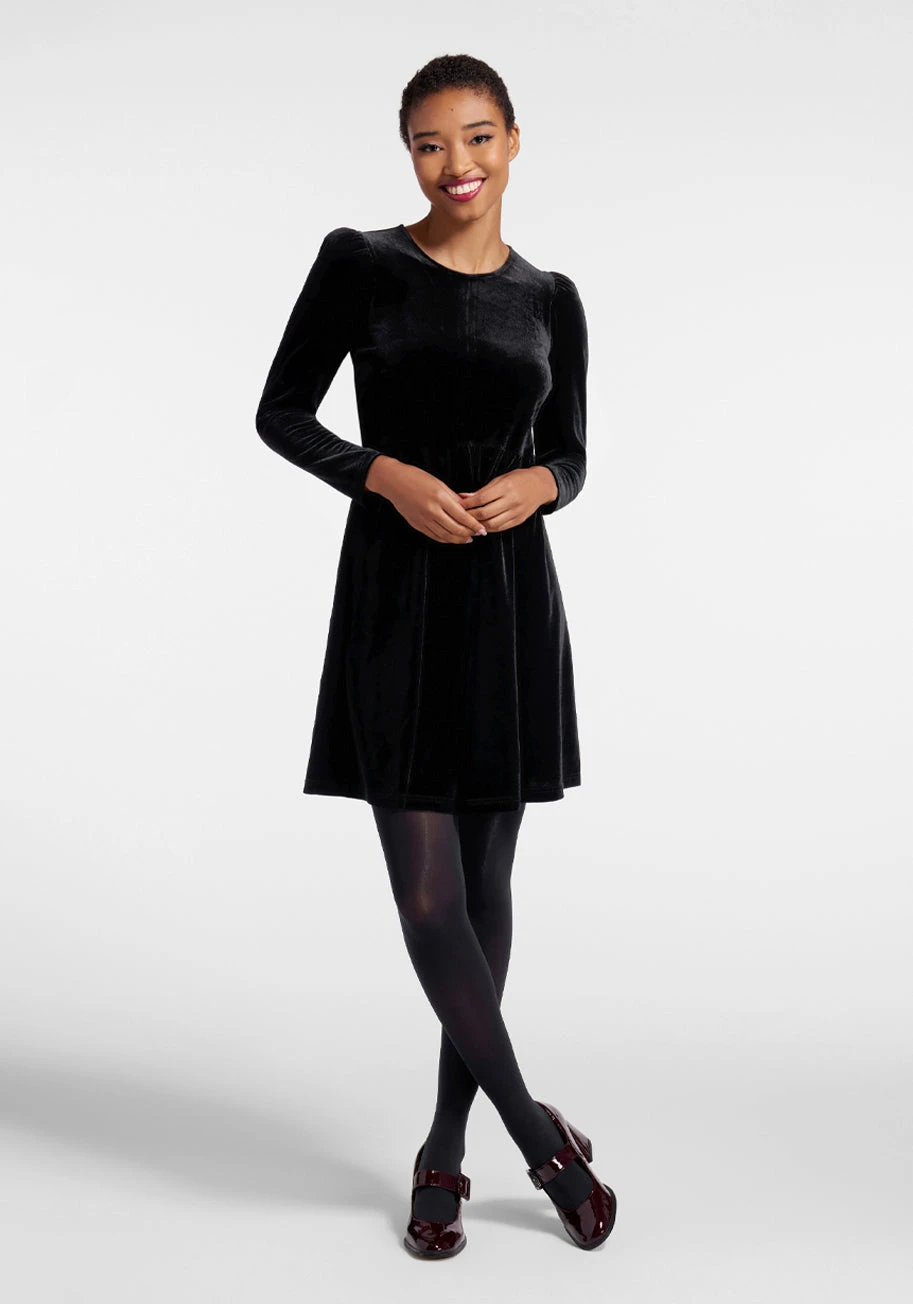 Elegant in its simplicity, this black crushed velvet skater dress from Australian brand Princess Highway is the ultimate versatile staple. Crafted from a stretchy, luxe fabric that catches the light beautifully, it features a classic scoop neckline and elegant long sleeves. The fitted bodice flows into a dramatic full circle skirt that finishes above the knee, offering a silhouette that is both flattering and playful.