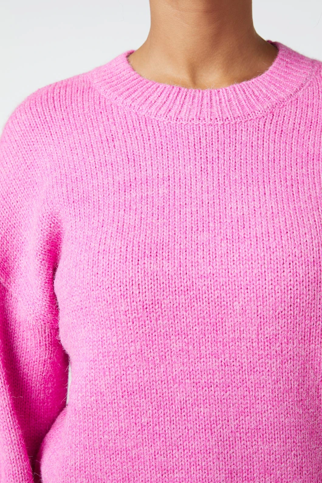 This sweater showcases a vibrant blue and pink knit pattern with a rich, textured finish. Designed with a high round neckline and a generous, relaxed fit through the torso and sleeves, it offers a contemporary look that is perfect for effortless everyday wear.