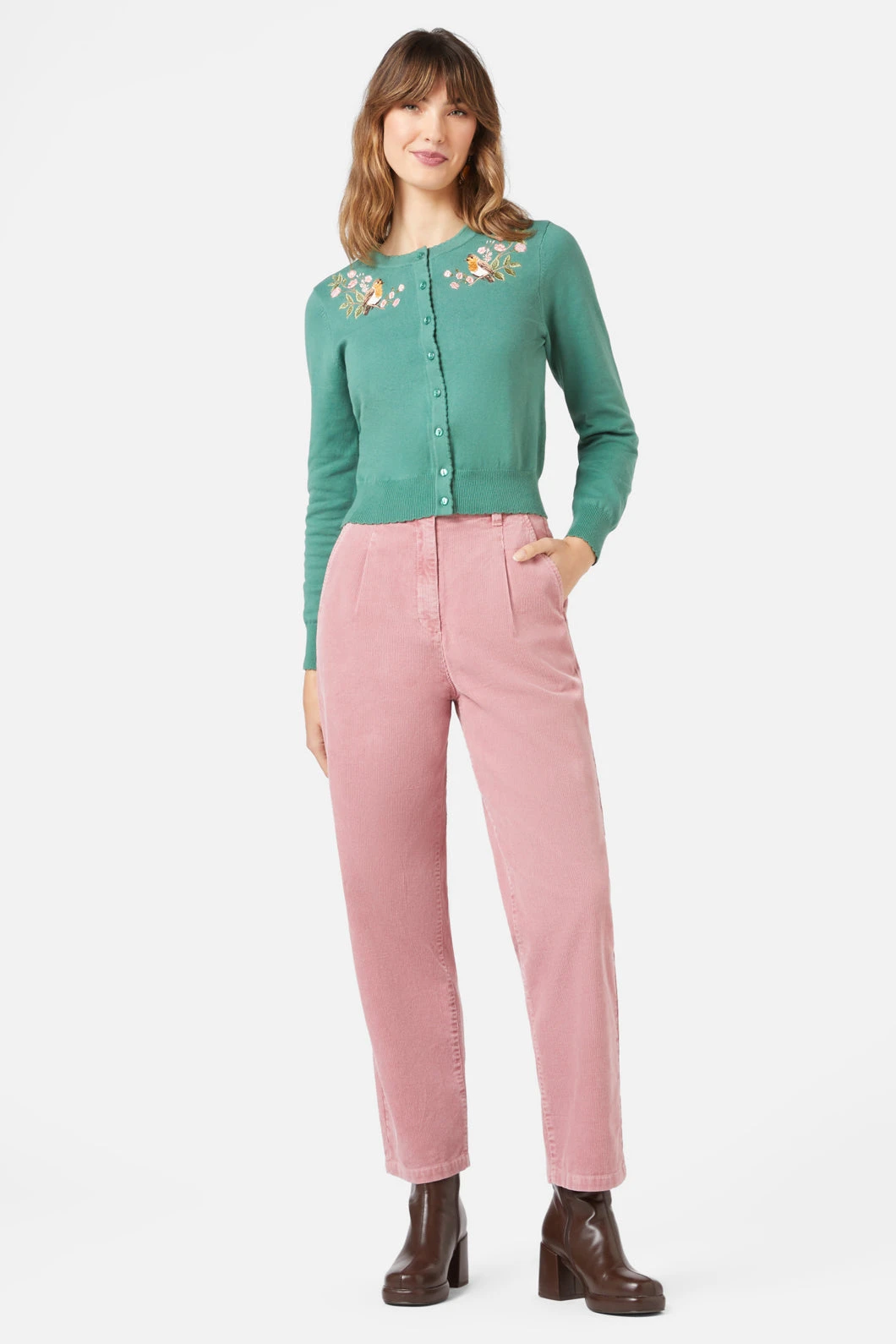 Elevate your everyday style with the Princess Highway Blossom & Robin Cardi. This charming green cardigan is designed for those who love nature-inspired aesthetics and classic vintage silhouettes. Featuring intricate embroidery of robins and flowers across the chest, it is a standout piece for any wardrobe.