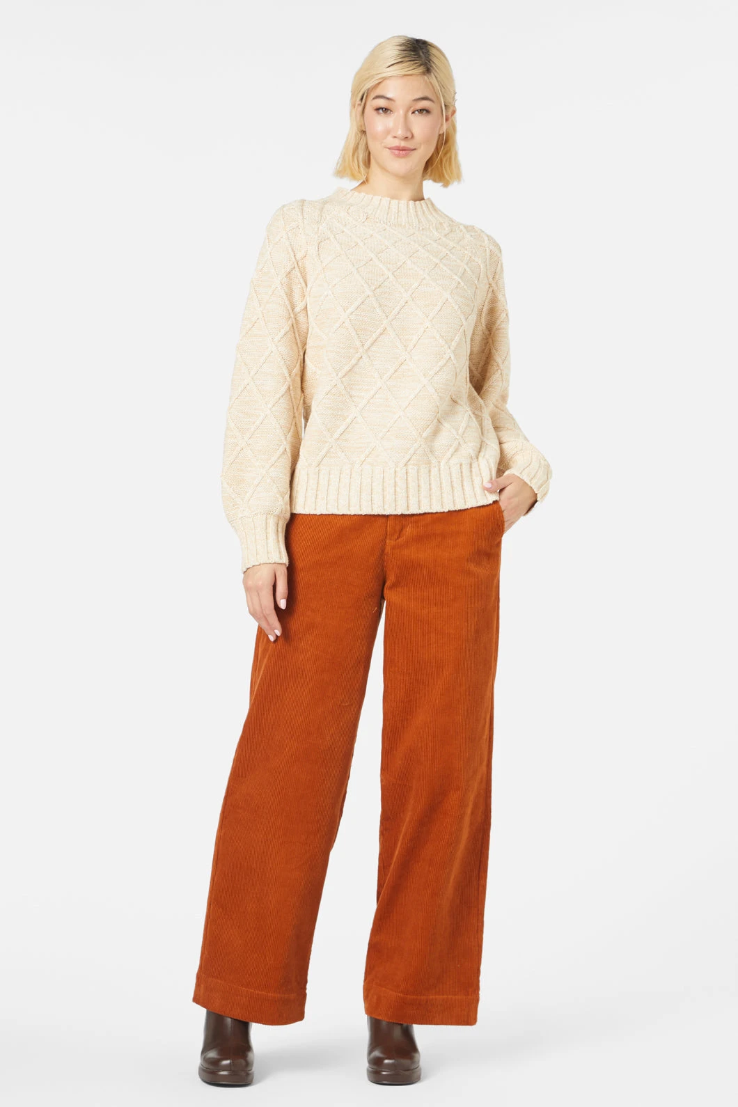 Showcasing a stunning two-tone green marled yarn, the Quinn Sweater features an intricate, raised diamond knit pattern that adds a tactile dimension to your winter wardrobe. The high ribbed neckline and matching cuffs provide a structured yet cozy silhouette that stands like a sentinel against the crisp winter air.