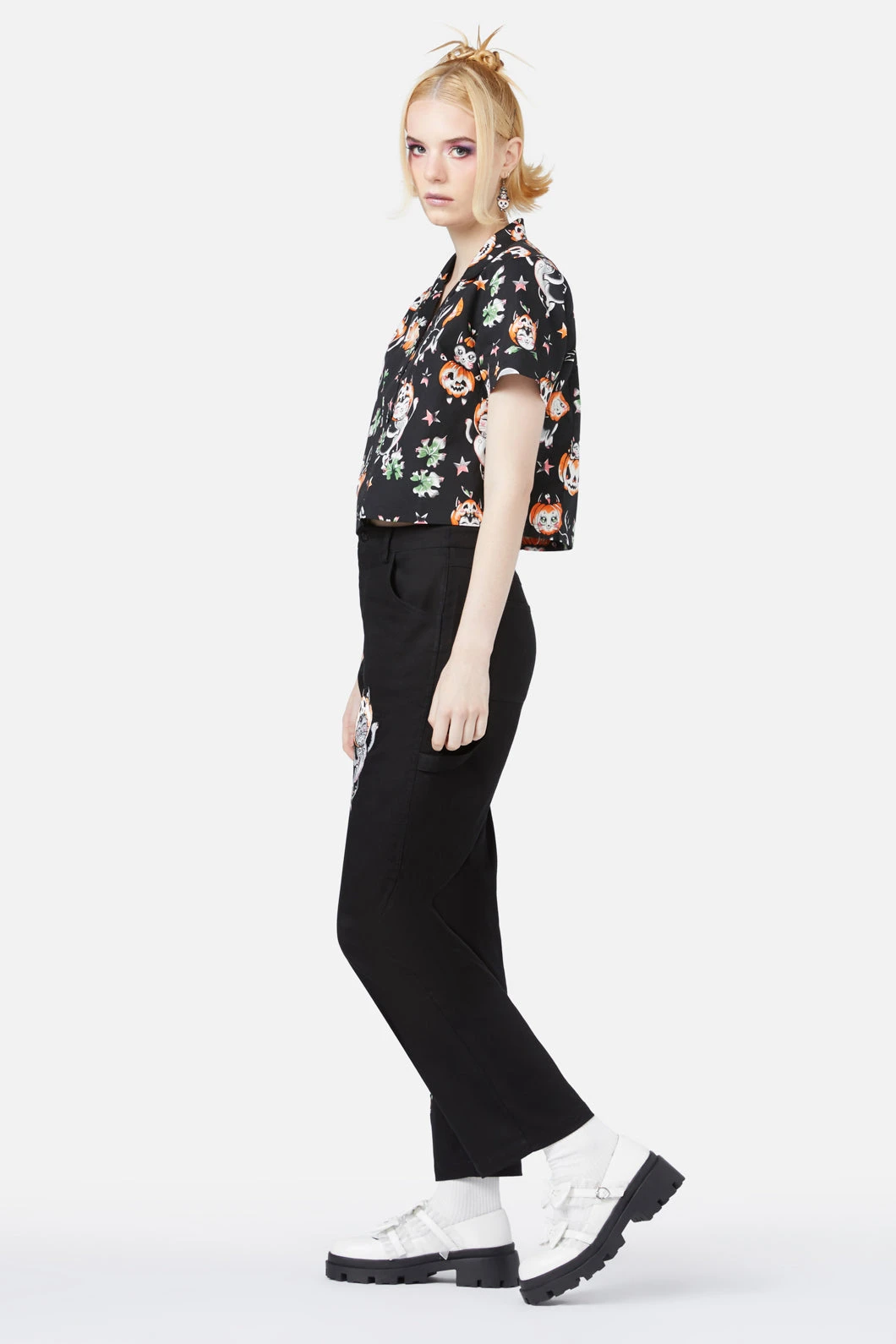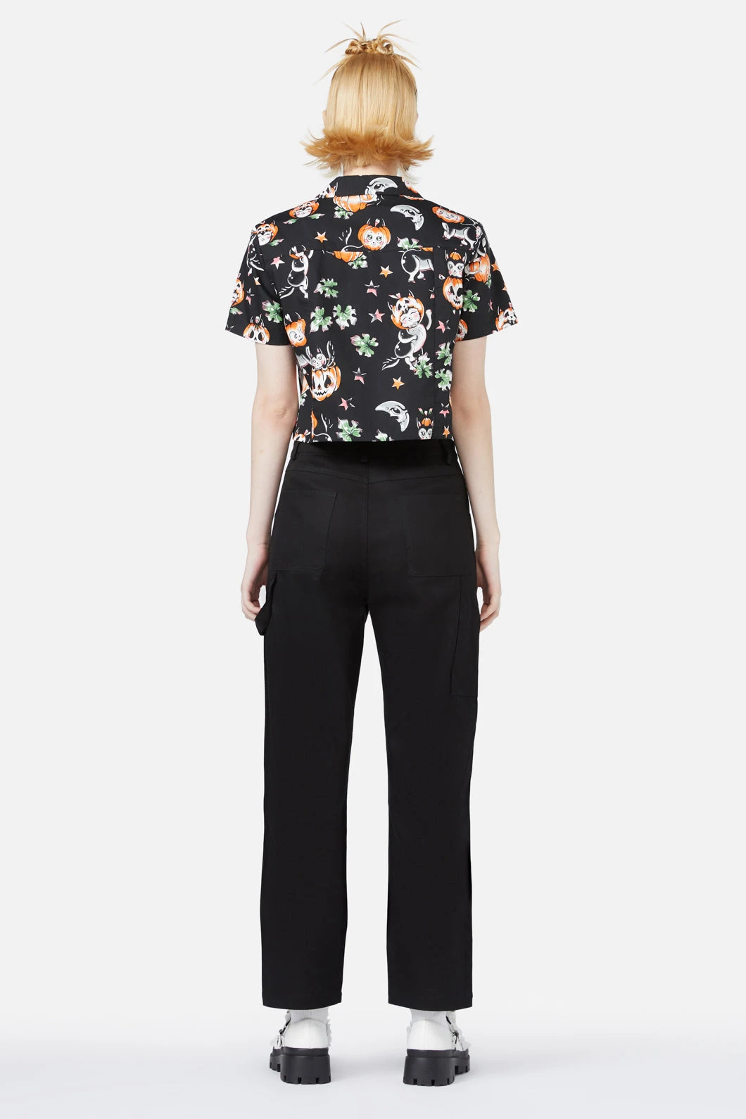 Playfully spooky and effortlessly chic, the Pumpkin Patch Kitty Blouse brings a quirky flair to your wardrobe. With an all-over ‘Pumpkin Patch Kitty’ print, created in collaboration with artist Ella Mobbs, this blouse is a whimsical blend of fun and fashion. Featuring short sleeves and a classic collar, the button-down placket at the front and cropped length add a trendy touch. The relaxed fit makes it easy to style for casual days or playful nights out.