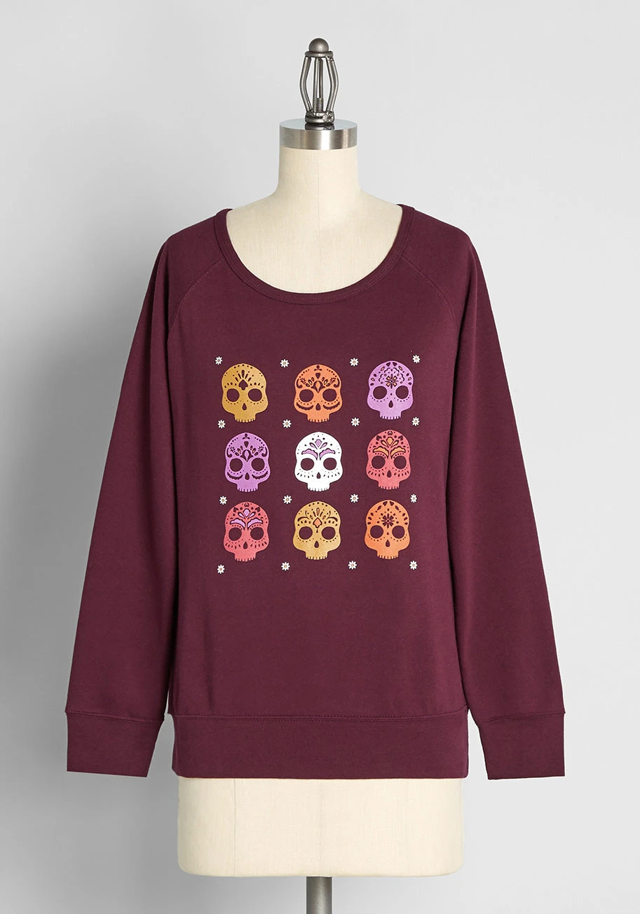 A signature style from our DÃa de los Muertos collection, you’ll want to snuggle up in sugary style with this sweatshirt. From our ModCloth namesake label, the style was crafted by our in-house design team. The maroon knit pullover style comes to life with colorful sugar skull graphics in multiple hues, and keeps it cozy with a crew neck and long sleeves.