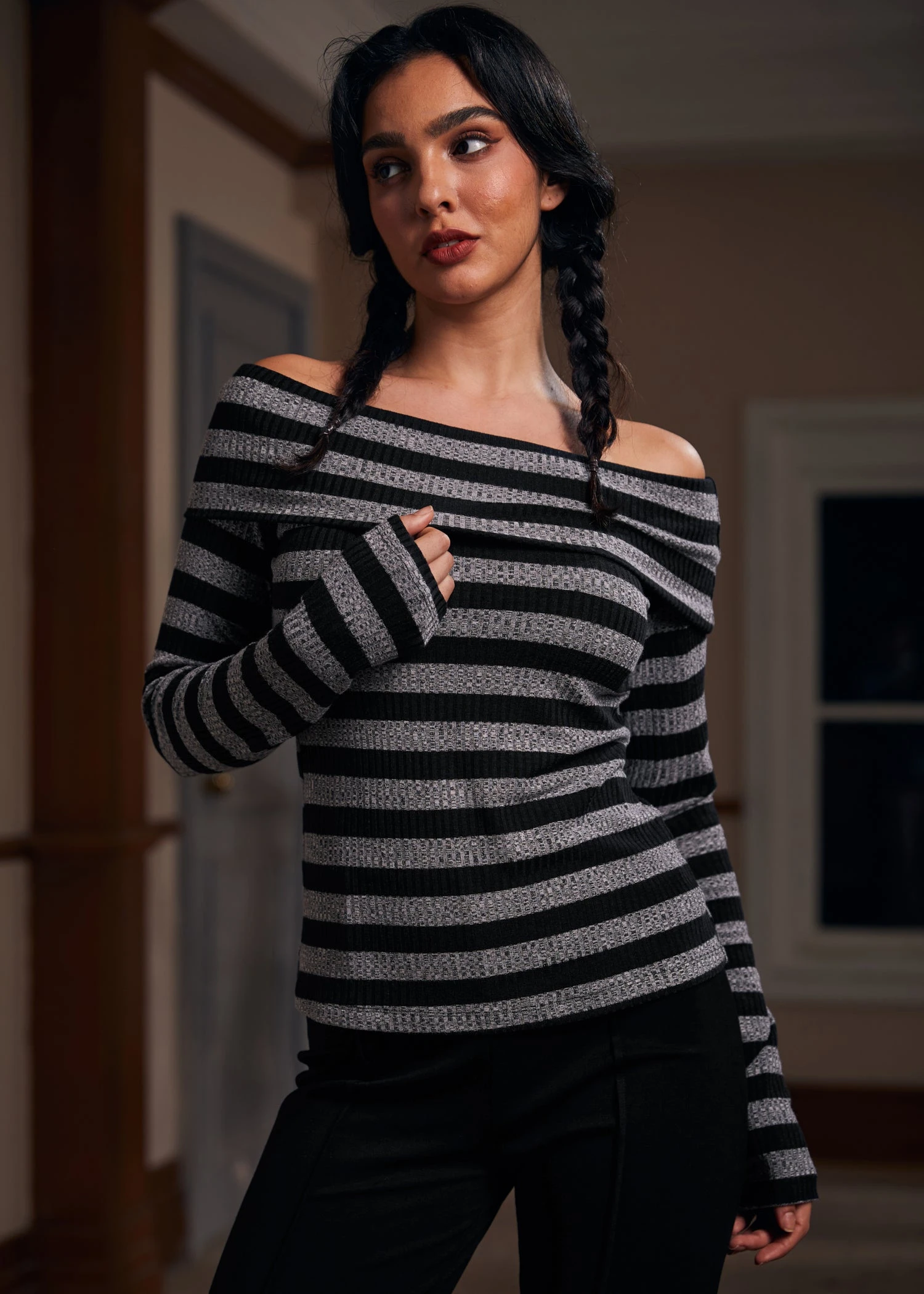 Embrace the crisp air of fall with the Whimsy in the Woods Top, a timeless piece from our ModCloth namesake label. Crafted from rib stripe knit fabric, this off-shoulder long-sleeved top is the epitome of autumnal elegance and comfort. Its knit construction offers medium stretchability, ensuring a cozy fit that moves with you. Perfect for those leisurely hayrides, evening bonfires, or casual outings with friends, the Fall Breeze Blouse pairs effortlessly with your favorite denim or skirts, making it a versatile addition to your fall wardrobe that celebrates the season’s casual yet fashionable essence.